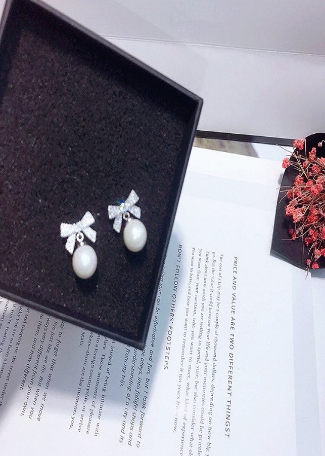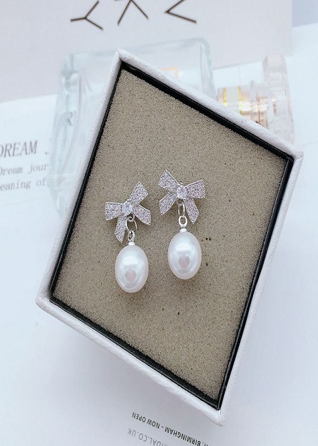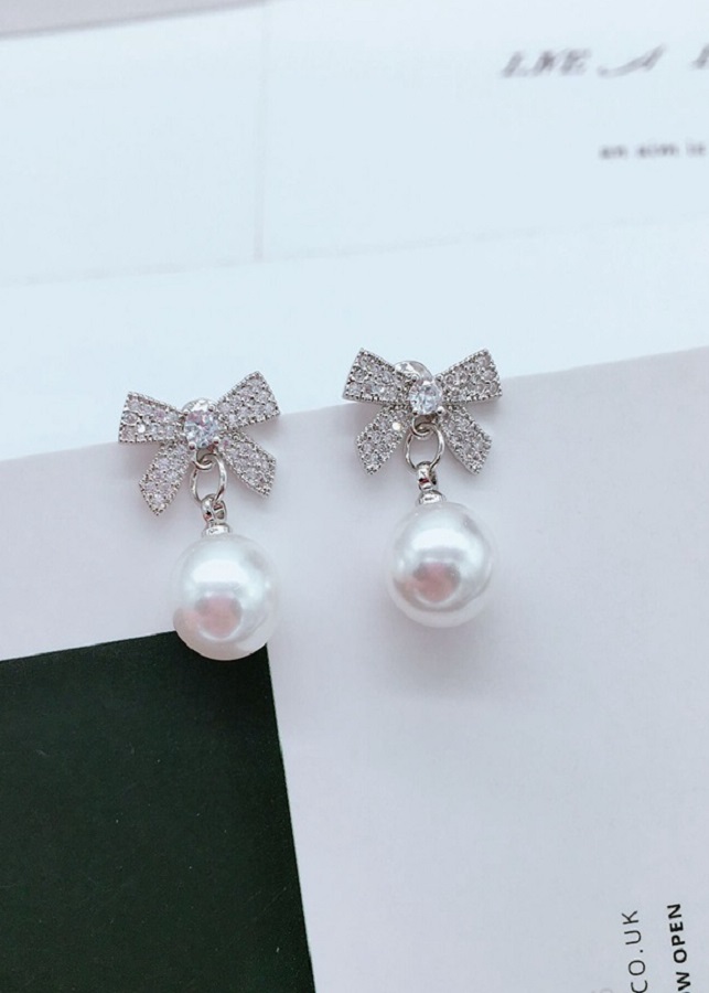 Bông Tai Bạc S925 Họa Tiết Nơ Đính Đá Xinh Xắn Đính Ngọc Trai Siêu Dễ Thương