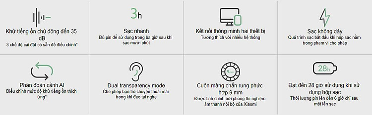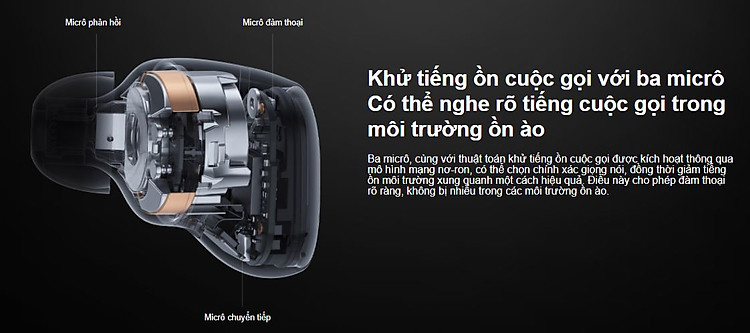 .*Chức năng khử tiếng ồn được kích hoạt thông qua công nghệ khử tiếng ồn chủ động. Chức năng này hỗ trợ khử tiếng ồn sâu tối đa là 35 dB, có thể giảm tiếng ồn môi trường lên đến 98%. Dữ liệu kiểm tra được cung cấp bởi Viện đo lường quốc gia Trung Quốc. Kết quả thực tế có thể khác tùy vào kích thước tai của người dùng, tai nghe được chọn, cấu trúc ống tai, cách đeo tai nghe, người dùng đang nhai hoặc đang tập luyện, v.v.