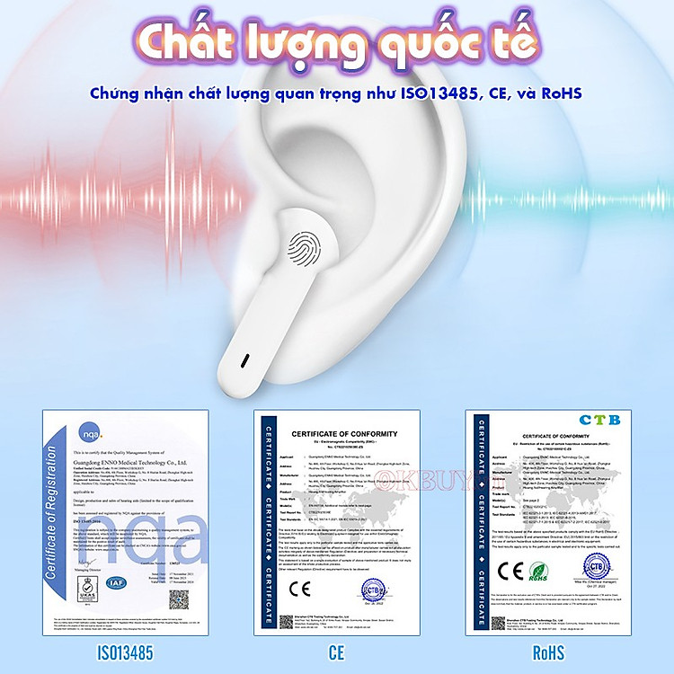 Máy trợ thính không dây FUNMIC EN-D19 đạt được nhiều chứng nhận chất lượng quan trọng như ISO13485, CE, và RoHS, khẳng định sản phẩm đáp ứng tiêu chuẩn an toàn và chất lượng cao trong lĩnh vực chăm sóc sức khỏe thính giác.