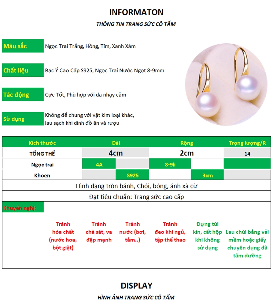 Kích thước | Hạt ngọc 8-9lyKích thước bông tai 3.5*0.9cm |