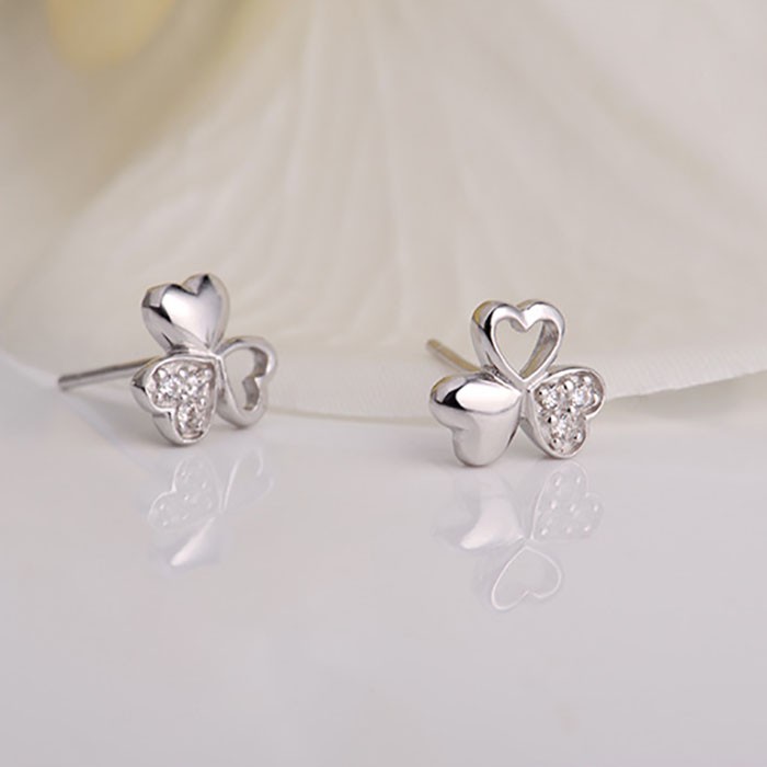 Bông tai nữ hình cỏ 3 lá, thiết kế trái tim dễ thương khuyên tai đẹp mạ bạc cao cấp