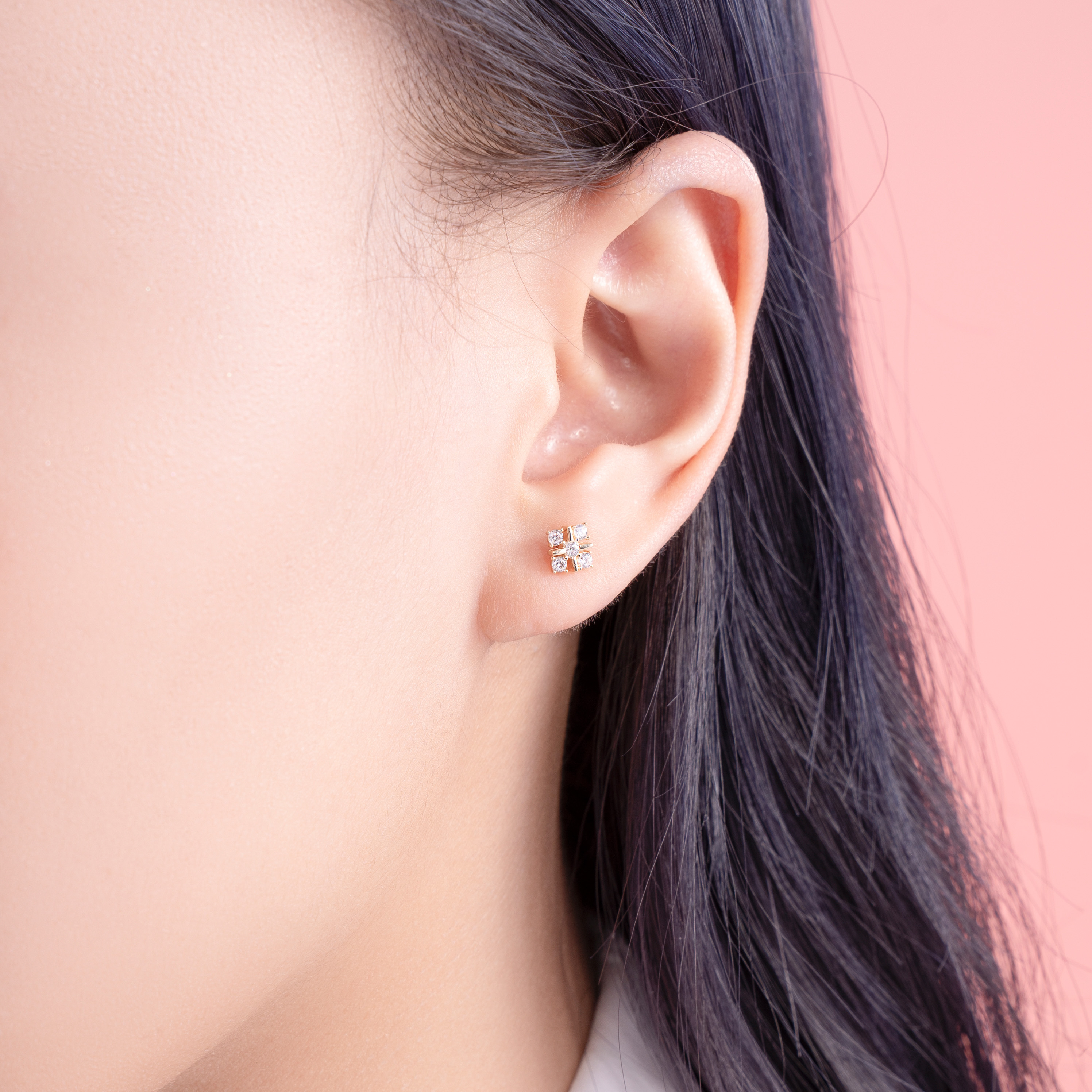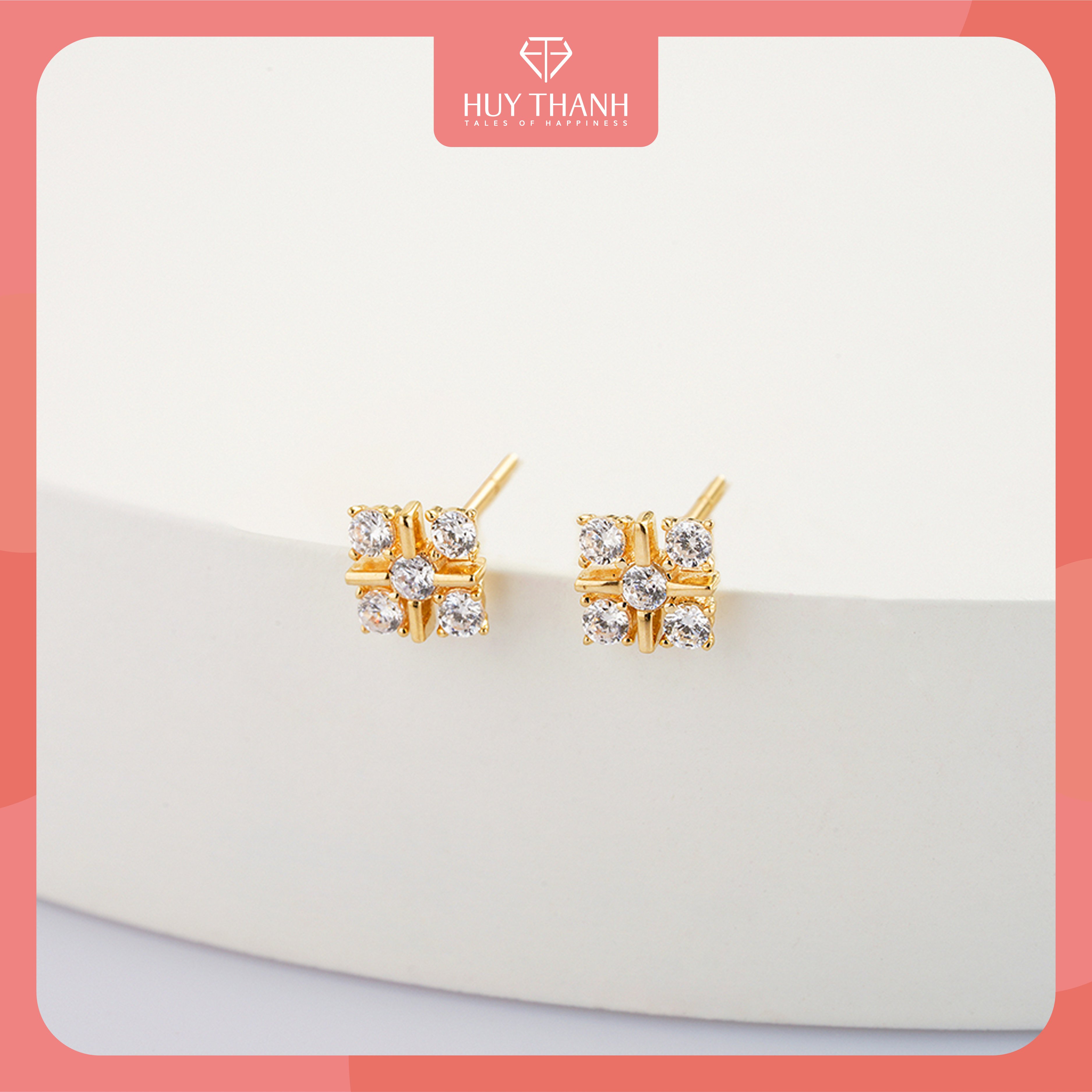 - Bông tai được thiết kế với 4 viên đá CZ xếp cân xứng với tâm điểm là 1 viên đá chủ ở giữa, tổng thể góc cạch giúp làm bật nét cá tính mà ko kém phần thanh lịch.