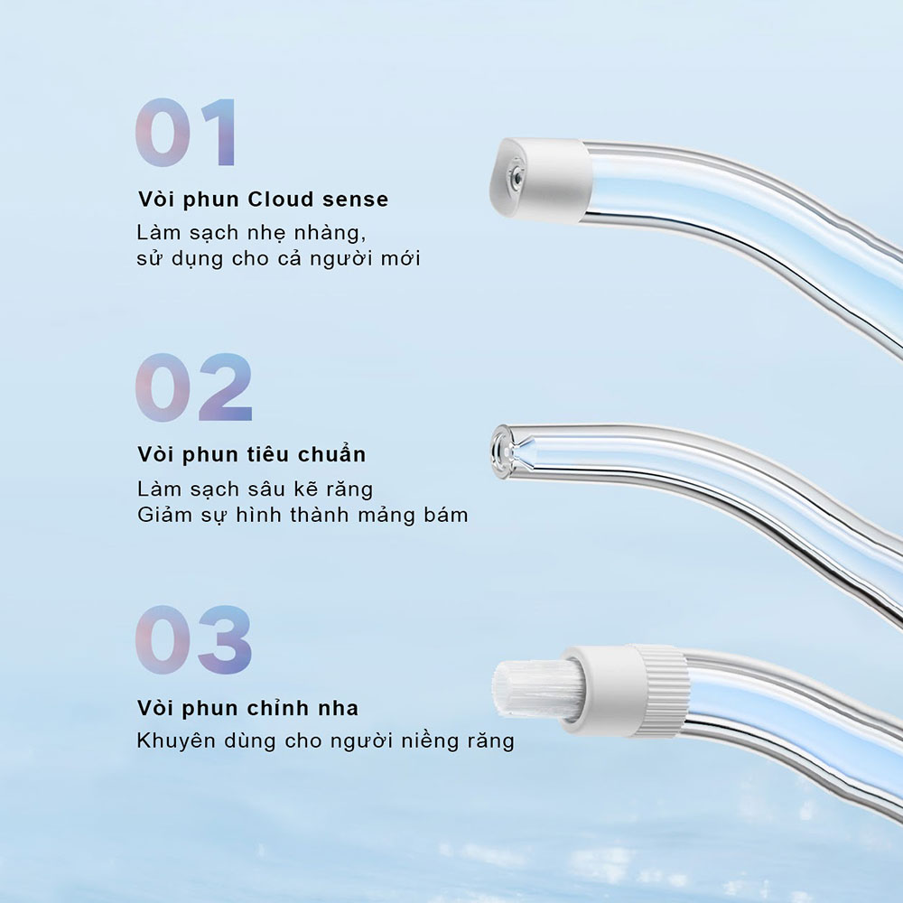 Vòi phun đa hiệu ứng Cloud sense giúp bạn làm sạch răng miệng nhẹ nhàng, thích hợp sử dụng với cả người mới. Vòi phun tiêu chuẩn xả nước mạnh để làm sạch kẽ răng, dưới nướu, loại bỏ vi khuẩn và làm giảm sự hình thành của mảng bám. Còn vòi chỉnh nha cũng có công dụng như vòi tiêu chuẩn, tuy nhiên nó được thiết kế để dành riêng cho người niềng răng hoặc đang sử dụng các công cụ hỗ trợ chỉnh nha, cho hiệu quả làm sạch cặn thức ăn và loại bỏ mảng bám xung quanh mắc cài niềng răng.