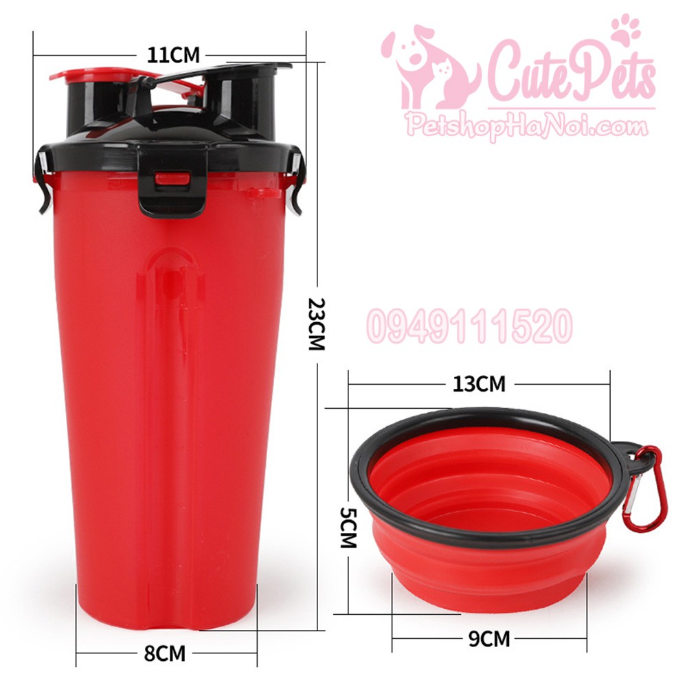 [Tặng bát] Bình nước du lịch 2 trong 1 đựng nước và thức ăn dành cho chó mèo - CutePets - Kích thước bình: Cao 23cm x đường kính đáy 8cm x đường kính miệng 11cm - Kích thước bát: cao 5cm x đáy 9cm x miệng 13cm - Công dụng: Dùng cho các cuộc picnic, du lịch cùng thú cưng mà k lo cúng bị đói, khát vì đã luôn có bình đựng nước và thức ăn bên mình nhỏ gọn và tiện lợi. ❤ [BPA-FREE CHẤT LIỆU] --- Chất liệu NHỰA PP và KHÔNG CHỨA BPA 100% silicone không chứa chất độc hại ❤ [2 trong 1] --- Một chai, đựng cả nước và thức ăn trong 2 ngăn độc lập. 250 gam hạt và 350 ml nước ❤ [Tặng kèm 1 bát du lịch gấp gọn] --- Sản phẩm được tặng kèm 1 bát du lịch gấp gọn có thể treo kèm vào với bình ❤ [THIẾT KẾ CHỐNG TRƠN TRƯỢT] --- cưng Của Chúng Ta thức ăn và uống chai được thiết kế với ngón tay rãnh trên cả hai bên, dễ cầm nắm, ngay cả trẻ em của bạn cũng có thể giữ chai đều đặn. ---------------------------------------------------------- - Xuất xứ: Trung Quốc - Công ty sản xuất: Taizhou Huangyan Emperor Pet Plastic Industry Co., Ltd - Địa chỉ công ty: Chiết Giang, Trung Quốc
