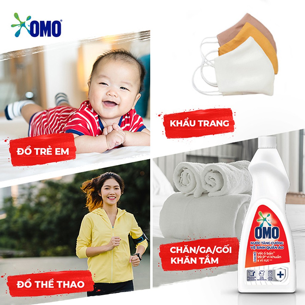 Nước Tăng Cường Vệ Sinh Quần Áo OMO là sản phẩm chuyên dụng giúp loại bỏ đến 99.9% vi khuẩn và vi rút, đồng thời hỗ trợ loại bỏ các vết ố bẩn cứng đầu cho quần áo được bảo vệ sạch sẽ. Định dạng hoàn hảo cho việc giặt & khử trùng khẩu trang Sản phẩm giúp bảo vệ vải vóc, nhẹ nhàng trên vải và không làm bay màu vải. Phù hợp cho nhiều loại áo quần kể cả chăn/ ga/ gối, đồ lót, đồ thể thao, khăn tắm, đồ trẻ em. Dịu nhẹ với da tay Sản phẩm thích hợp cho cả ngâm hoặc xả. Hướng dẫn sử dụng: