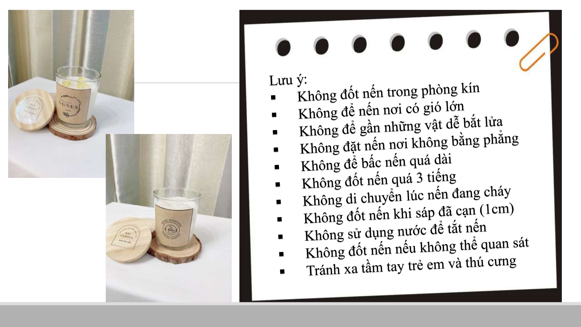- Vị trí đặt nến: ở nơi an toàn thông thoáng, trên mặt phẳng chịu nhiệt. Không đốt nến nơi có gió quạt, máy lạnh, vật nuôi và trẻ em. Tránh đốt nến thơm trong phòng có không gian kín.