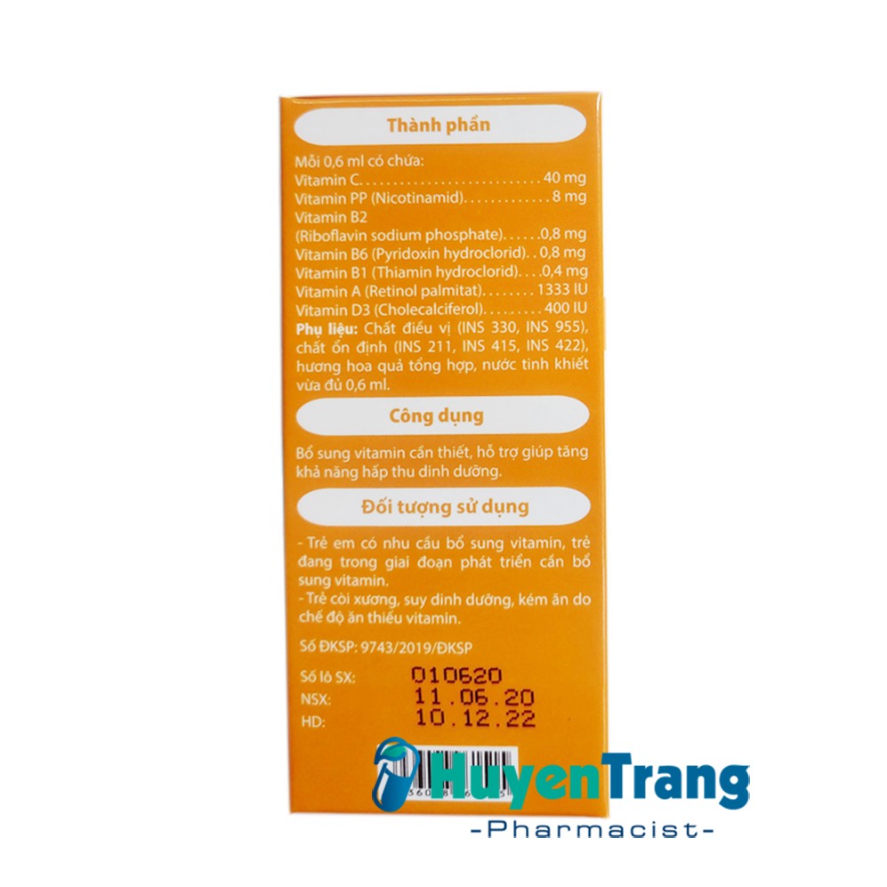 - Vitamin A: Tăng cường miễn dịch, tăng cường thị giác, phòng bệnh khô mắt, quáng gà - Vitamin PP, Vitamin B1, Vitamin B2, Vitamin B6: Giúp trẻ ăn ngon. Chuyển hóa năng lượng, phát triển hệ thần kinh - Vitamin D3: Tăng hấp thu canxi, phòng còi xương - Vitamin C: Nhanh làm lành vết thương, giúp cơ bắp, da khỏe mạnh,tăng hấp thu sắt