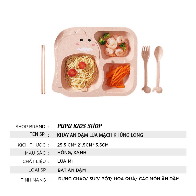 Giới thiệu (Tặng thìa, dĩa, đũa) Khay ăn dặm lúa mạch hình khủng long cho bé