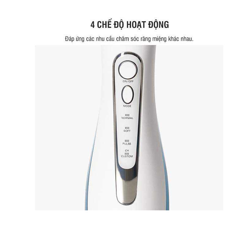 Các chế độ hoạt động (Đáp ứng các nhu cầu chăm sóc răng miệng khác nhau) 01. Đầu tăm nước xoay 360 ° - Làm sạch răng miệng theo nhiều hướng 02. Nút nhả vòi phun - Dễ dàng tháo vòi phun 03. Bình chứa nước có thể dễ dàng tháo rời Thuận tiện cho làm đầy và làm sạch bình nước 04. Thiết kế cổng sạc USB - Có thể sạc đầy trong vòng 4 giờ. Và một lần sạc đầy có thể sử dụng được lên đến 20 ngày