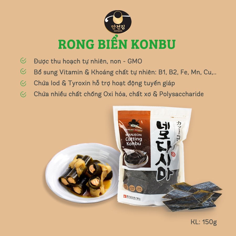 Tảo bẹ kombu được thu hoạch tự nhiên từ vùng biển của Hàn Quốc. Sản phẩm thu hoạch tự nhiên, non-GMO. Bạn có thể nấu nước dùng Daishi từ Tảo bẹ Kombu của Manjun Foods cho hương vị rất tuyệt vời