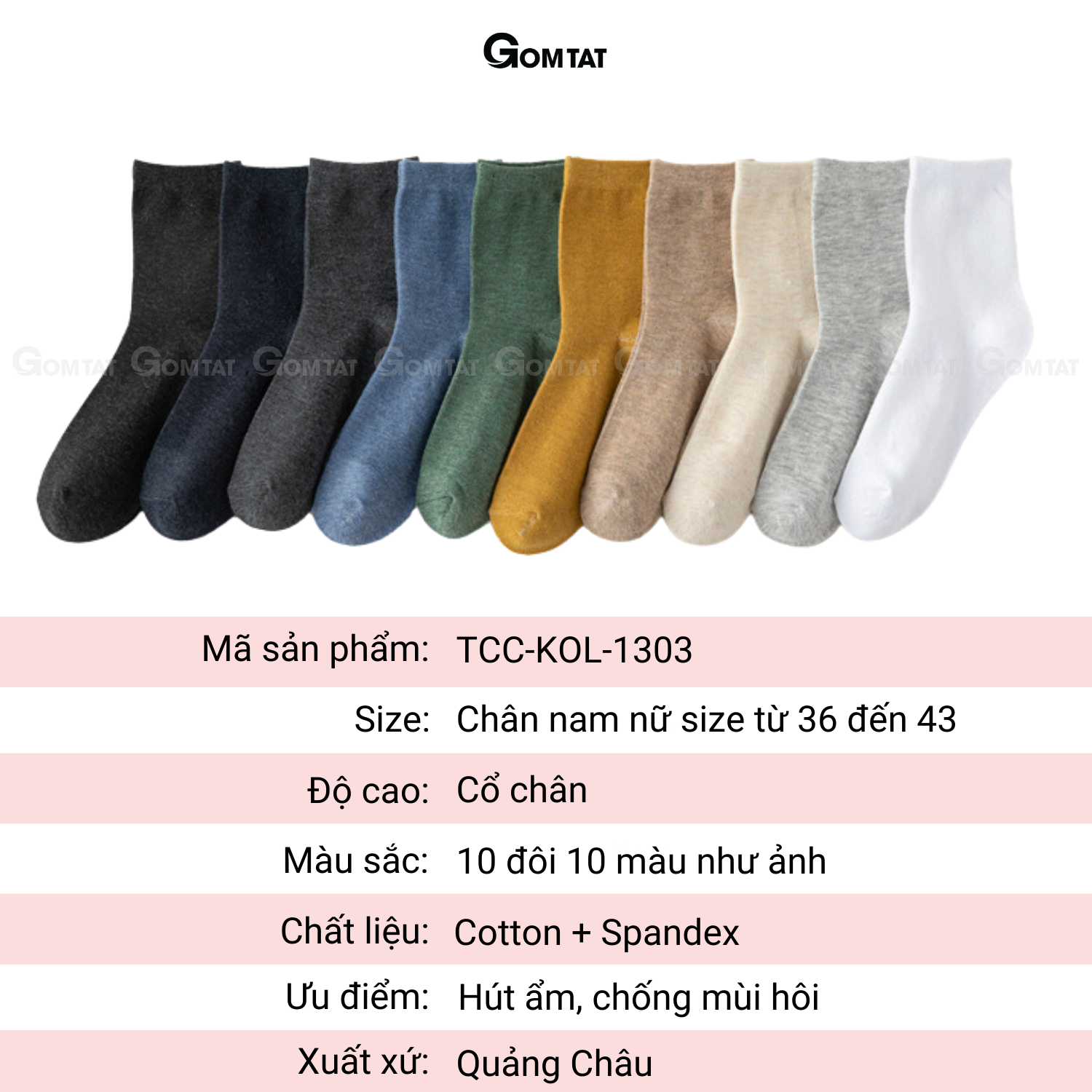 Tất cổ cao nam nữ GOMTAT chất liệu cotton co giãn thoáng mát, êm chân hút ẩm khử mùi - TCC-KOL-1303-1DOI: loại vớ cổ cao với tone màu nhẹ nhàng rất dễ để phối với giày thể thao, giày vải hoặc giày tây công sở, chất liệu cotton khử mùi thoáng khí, êm ái khi sử dụng.