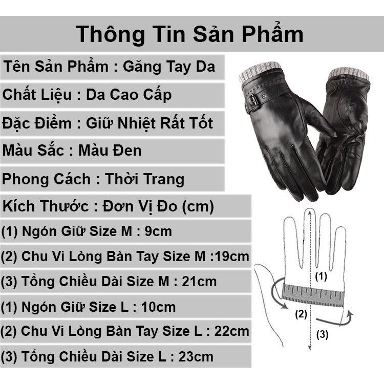 THÔNG TIN SẢN PHẨM - Tên Sản Phẩm : Găng Tay Da - Chất Liệu : Da Pu Cao Cấp - Kích Thước : - Size M : + Ngón Giữ : 9cm + Chu Vi Lòng Bàn Tay : 19cm + Tổng Chiều Dài : 21cm -Size L : + Ngón Giữ : 10cm + Chu Vi Lòng Bàn Tay : 22cm + Tổng Chiều Dài : 23cm - Đặc Điểm : Giữ Nhiệt ,Giữ Ấm Tốt ,Cảm Ứng Điện Thoại Siêu Mượt - Màu Sắc : Màu Đen