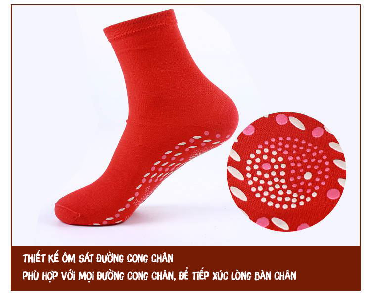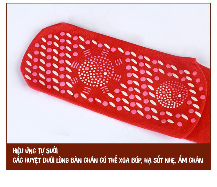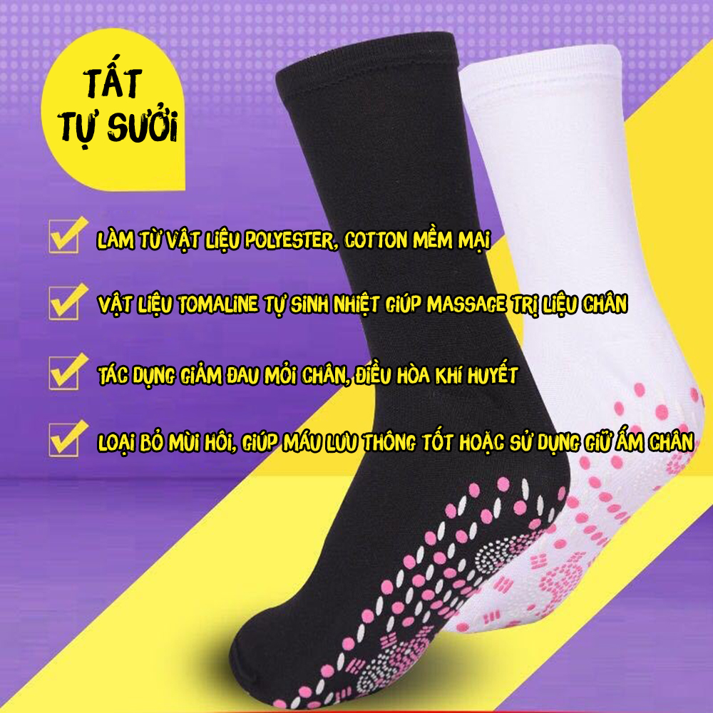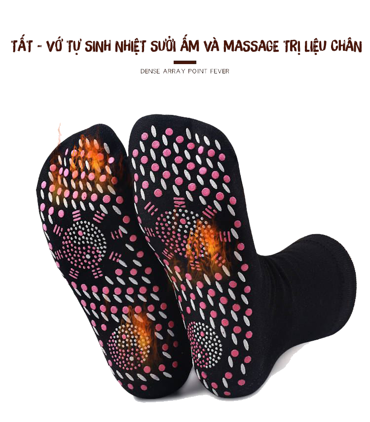 Tất – Vớ tự sinh nhiệt được làm từ vật liệu polyester, cotton mềm mại, bên dưới là lớp đá tomaline tự sinh nhiệt giúp giữ ấm cho chân, Massage trị liệu rất hiệu quả. Tác dụng giảm đau mỏi chân, điều hòa khí huyết, loại bỏ mùi hôi giúp máu lưu thông tốt Bàn chân có mối quan hệ chặt chẽ đối với các bộ phận khác của cơ thể, đặc biệt là các nội tạng bên trong. Tất cả các nội tạng và cơ quan của cơ thể người đều có mối liên quan và phản ánh điểm trên bàn chân (mỗi vị trí phản ánh 1 cơ quan nội tạng như: tim, gan, thận…). Do đó việc Massage, giữ ấm những điểm trên bàn chân cũng chính là chăm sóc các cơ quan nội tạng giúp cho các cơ quan nội tạng tránh khỏi bệnh tật, từ đó giúp ta khỏe mạnh. Đặc biệt tất tự sinh nhiệt và Massage trị liệu giúp làm ấm bàn chân tự nhiên giúp thúc đẩy một cách hiệu quả lưu thông máu, nó có ý nghĩa quan trọng đối với cơ thể cho việc tăng quá trình trao đổi chất, điều chỉnh nội tiết, giữ cân bằng giữa huyết tương và chất lỏng cơ thể. Bàn chân là một trong những bộ phận xa tim nhất nên nhiệt độ thấp nhất, sử dụng tất Massage tự sinh nhiệt có thể làm tăng khả năng miễn dịch cho toàn bộ cơ thể.
