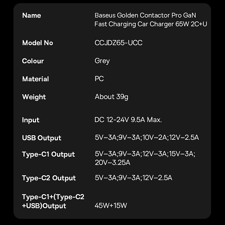 Tính năng Tẩu sạc Baseus Golden Contactor Pro GaN C00035202841-00 65W, Fast Charging U+2C - Hàng Chính Hãng