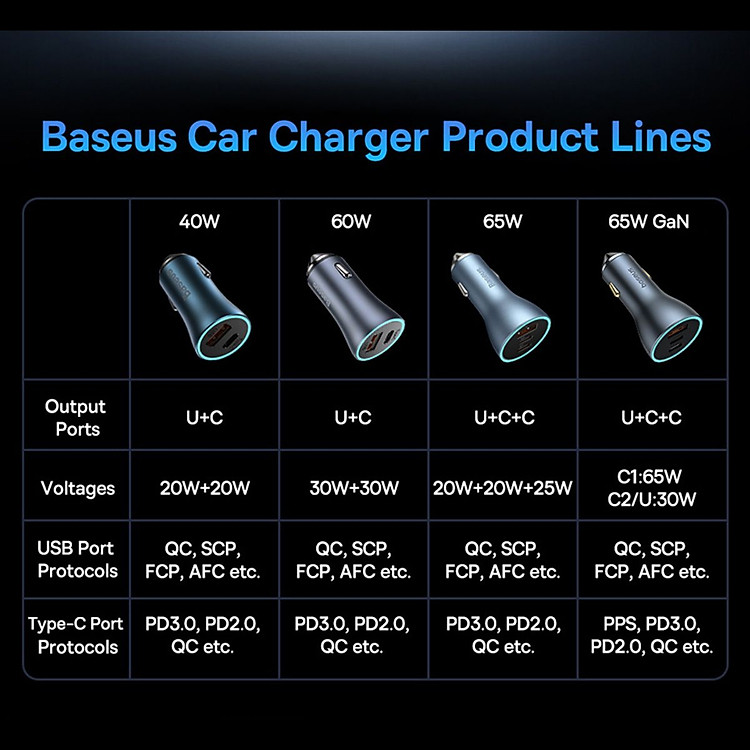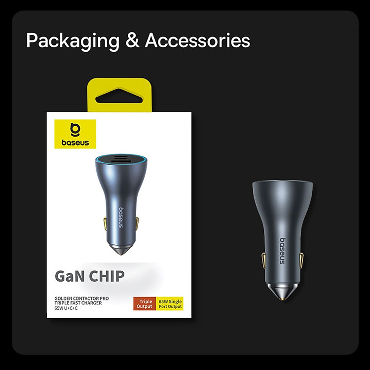 Baseus Golden Contactor Pro GaN Fast Charging Car Charger U+2C 65W là một tẩu sạc ô tô sử dụng công nghệ GaN (nitrit gallium) để cung cấp công suất lớn với thiết kế nhỏ gọn.
