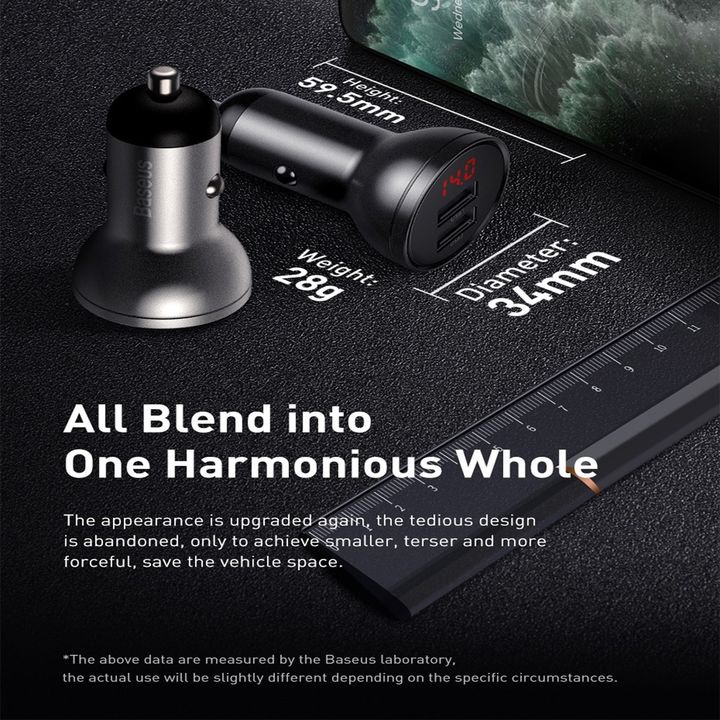 ➡ Giới thiệu tẩu sạc đa năng công suất cao Baseus 45W, 2 Ports USB, LED Display, SPC/ QC4.0 Car Quick charger Thông số sản phẩm - Chất liệu: Nhôm, nhựa ABS, nhựa PC - Nguồn vào: DC 12-24V - Nguồn ra: USB 1: 4.5V—5A; 5V—4.5A; 5V=3A; 9V—3A; 12V—2.5A; 20V—1.5A - Nguồn ra USB 2: 4.5V—5A; 5V—4.5A; 5V=3A; 9V—3A; 12V—2.5A; 20V—1.5A - Tổng nguồn ra: 45W (22.5W + 22.5W) - Kích thước: 34mm*H59.5mm - Trọng lượng: 32g - Phụ kiện bao gồm dây Type C dài 1m - Sản phẩm có thiết kế hiện đại với 2 cổng sạc USB và còn được trang bị đồng hồ LED báo thông số dòng điện, điện áp tiện dụng. - Được trang bị chip xử lý nguồn thế hệ mới nhất, hỗ trợ nhiều chuẩn sạc nhanh khác nhau như SPC và QC3.0/4.0 - Sản phẩm hỗ trợ nhiều mức cấu hình điện áp ngỏ ra khác nhau như : 4.5V—5A; 5V—4.5A; 5V=3A; 9V—3A; 12V—2.5A; 20V—1.5A - Khả năng tự động nhận dạng thiết bị và điều chỉnh cấu hình điện áp ngỏ ra phù hợp với từng loại thiết bị - Hỗ trợ các mức điện áp ngỏ vào từ 12V - 24V, phù hợp với nhiều loại xe khác nhau - Tổng công suầt lên đến 45W, có thể sạc nguồn ổn định cho 2 thiết bị cùng lúc - Chất liệu kim loại, các tiếp điểm được thiết kế chắc chắn, tương thích với tất cả các loại xe. Cho hiệu suất sử dụng ổn định.