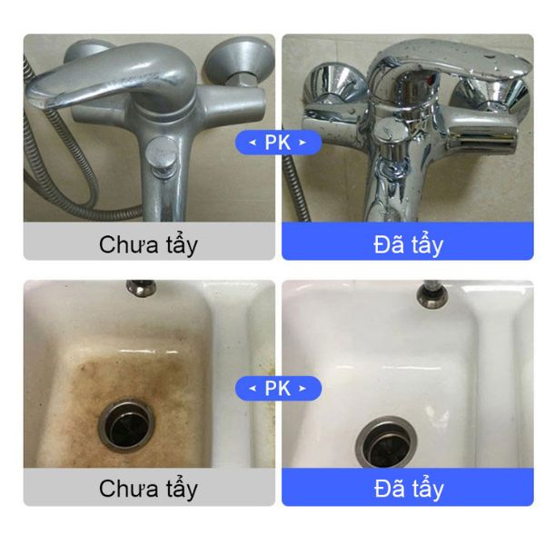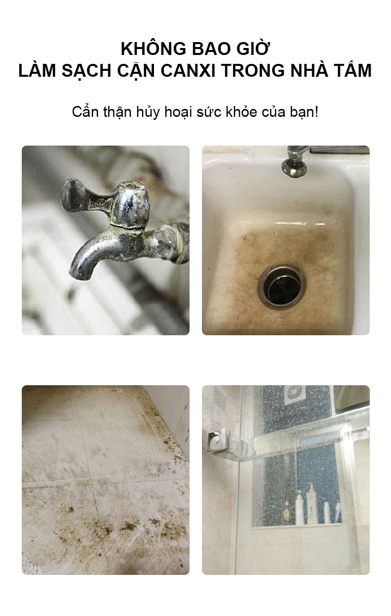 - Siêu tẩy cặn canxi dùng làm sạch vách kính, vòi rửa inox 304, chậu rửa sứ, bồn cầu, gạch men trắng trong nhà tắm bị bám cặn canxi, cặn nước, ố vàng.