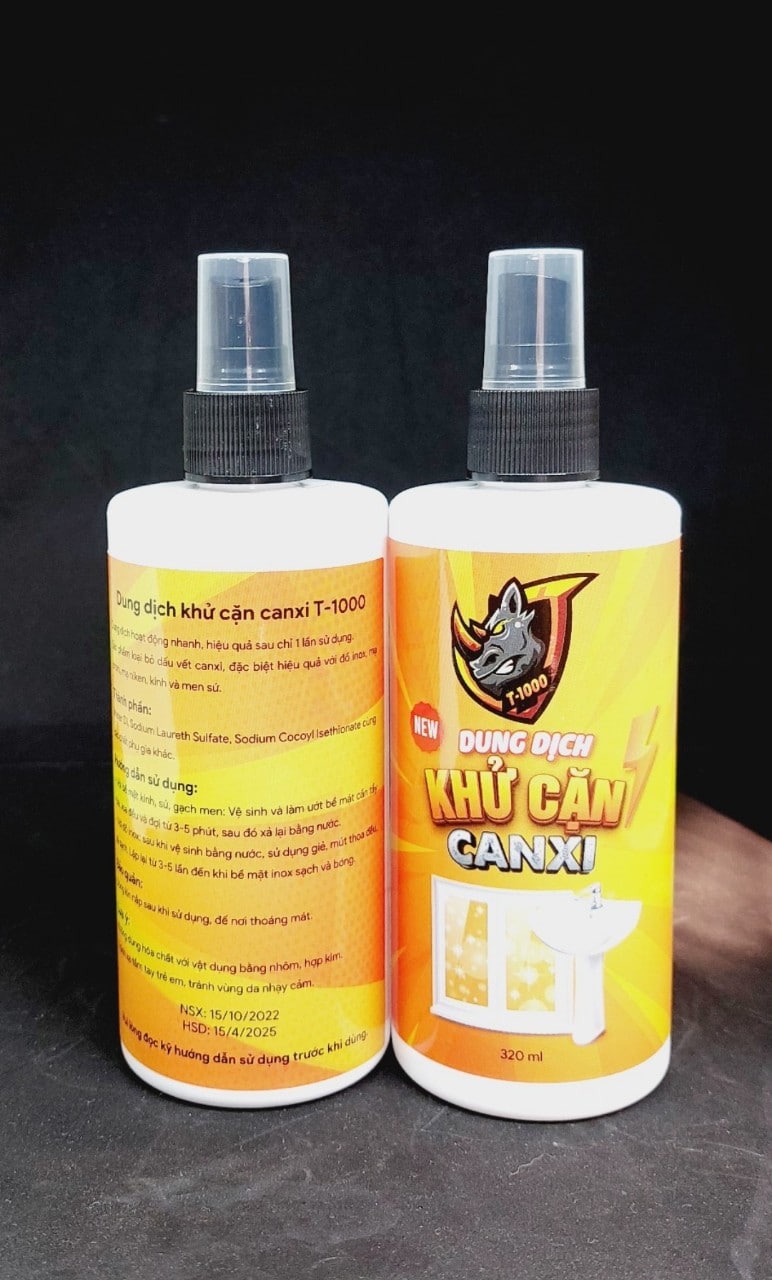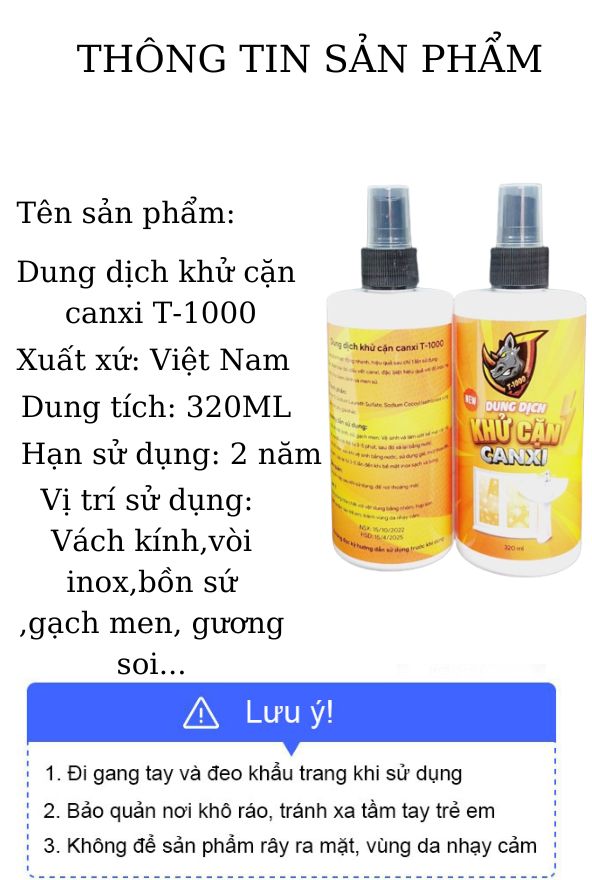 *Dung dịch khử cặn T1000 là sản phẩm dạng bình xịt dùng làm sạch cặn canxi bám trên vòi rửa inox trắng 304, vách kính, gương soi, bồn cầu, lavabo trong nhà tắm. Sản phẩm là chất tẩy rửa hoạt động mạnh giúp làm tan cặn canxi nhanh chóng, hiệu quả 100%.