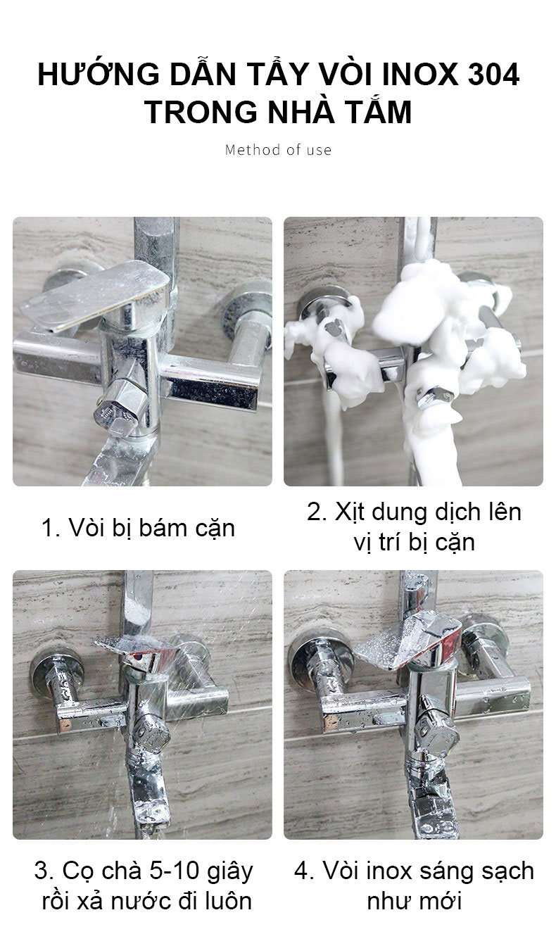 - Đối với vòi inox: Chỉ dùng cho vòi inox 304 trong nhà tắm, không dùng cho inox mạ vàng và crom. Làm ướt đẫm bề mặt inox bằng nước sạch, xịt hóa chất lên, dùng mút cọ đánh nhanh đều tay, xả lại nhiều lần bằng nước cho sạch, sau đó lau khô.