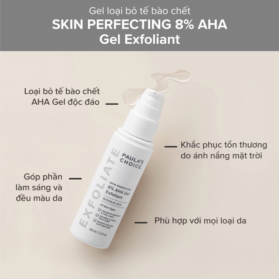Nếu cảm thấy không tự tin dùng BHA thì nàng đừng ngại trải nghiệm AHA nhà Paula nhé. gì chứ gương mặt nổi nhất trong các dòng AHA nhà Paula rồi, nhất là với làn sa sần sủi, không được căng mịn như làn da em bé thì AHA thực sự là một vị cứu tinh đó ạ . Paula’s Choice Skin Perfecting 8% AHA Gel là tẩy da chết hoá học nhưng lại rất nhẹ dịu tự nhiên, mang lại làn da mịn màng trẻ khoẻ hơn. . Kết cấu dạng gel siêu nhẹ sẽ dễ dàng thẩm thấu vào da, da dễ thích nghi với sản phẩm hơn. Công thức độc đáo của sản phẩm giúp tái tạo lớp da bề mặt, giải quyết vế đề về nếp nhăn, tăng cường cấu trúc da giúp da săn chắc và mềm mại hơn. . Kết hợp khả năng loại bỏ tế bào chết của axit glycolic với công thức gel siêu nhẹ cung cấp hydrat hóa ổn định và cải thiện đáng kể sự mịn màng của da. Công thức thành phần cũng chứa chiết xuất thực vật làm dịu da và chất chống oxy hóa. . Chiết xuất Cúc La Mã giúp chống Oxy hoá, cải thiện bề mặt da thô ráp. 8% Glycolic Acid giúp loại bỏ tế bào chết, làm mềm và tái tạo bề mặt da. . Sau một thời gian chăm chỉ sử dụng, da mình sẽ trở nên đều màu hơn, các nếp nhăn được làm đầy đáng kể đó nha