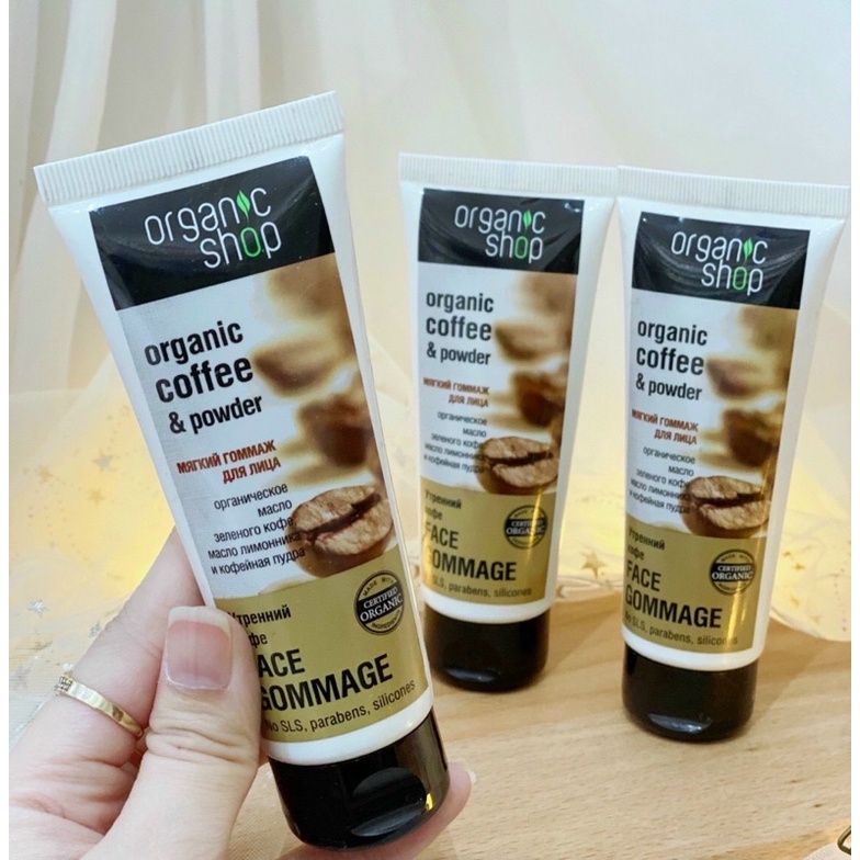 Kem tẩy da chết cà phê Organic Shop với thành phần từ thiên nhiên Cũng như tất cả các sản phẩm khác của hãng mỹ phẩm thiên nhiên Nga Organic Shop, kem tẩy da chết cho mặt chiết xuất cà phê được xây dựng từ các hợp chất quý giá trong các loại dầu thực vật, trong đó chủ đạo là tinh dầu cà phê Abrica cực giàu các chất chống ox /y hóa bảo vệ tế bào và làm sạch sâu. Cùng với các loại tinh dầu độc đáo khác như tinh dầu Macca, tinh dầu sả Viễn đông, dầu oliu,..., kem cung cấp hệ dinh dưỡng hoàn hảo cho da, giúp làm sạch da tự nhiên từ lỗ chân lông và được nuôi dưỡng tối ưu.