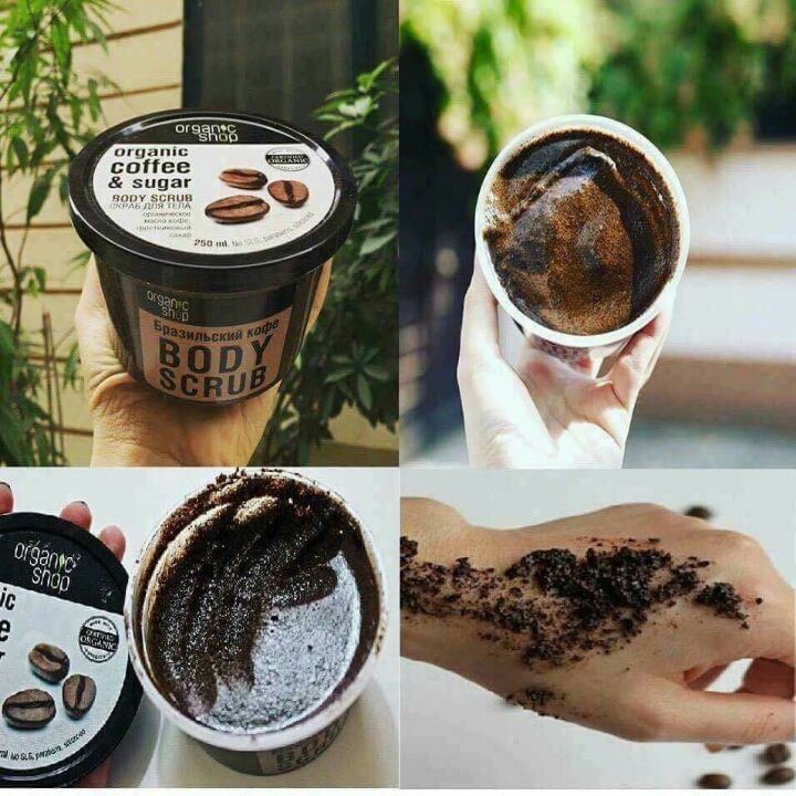 Tinh dầu cà phê không những bổ sung độ ẩm mà còn giúp thải độc, dưỡng da trắng sáng, đều màu. KẾT CẤU Tẩy tế bào chết toàn thân Organic Shop là dạng tẩy da chết vật lí nên được cấu tạo chủ yếu từ các hạt scrub giúp ma sát trên da để lấy đi lớp tế bào chết. Sản phẩm có màu nâu và mùi thơm ngọt dễ chịu từ đường và cà phê