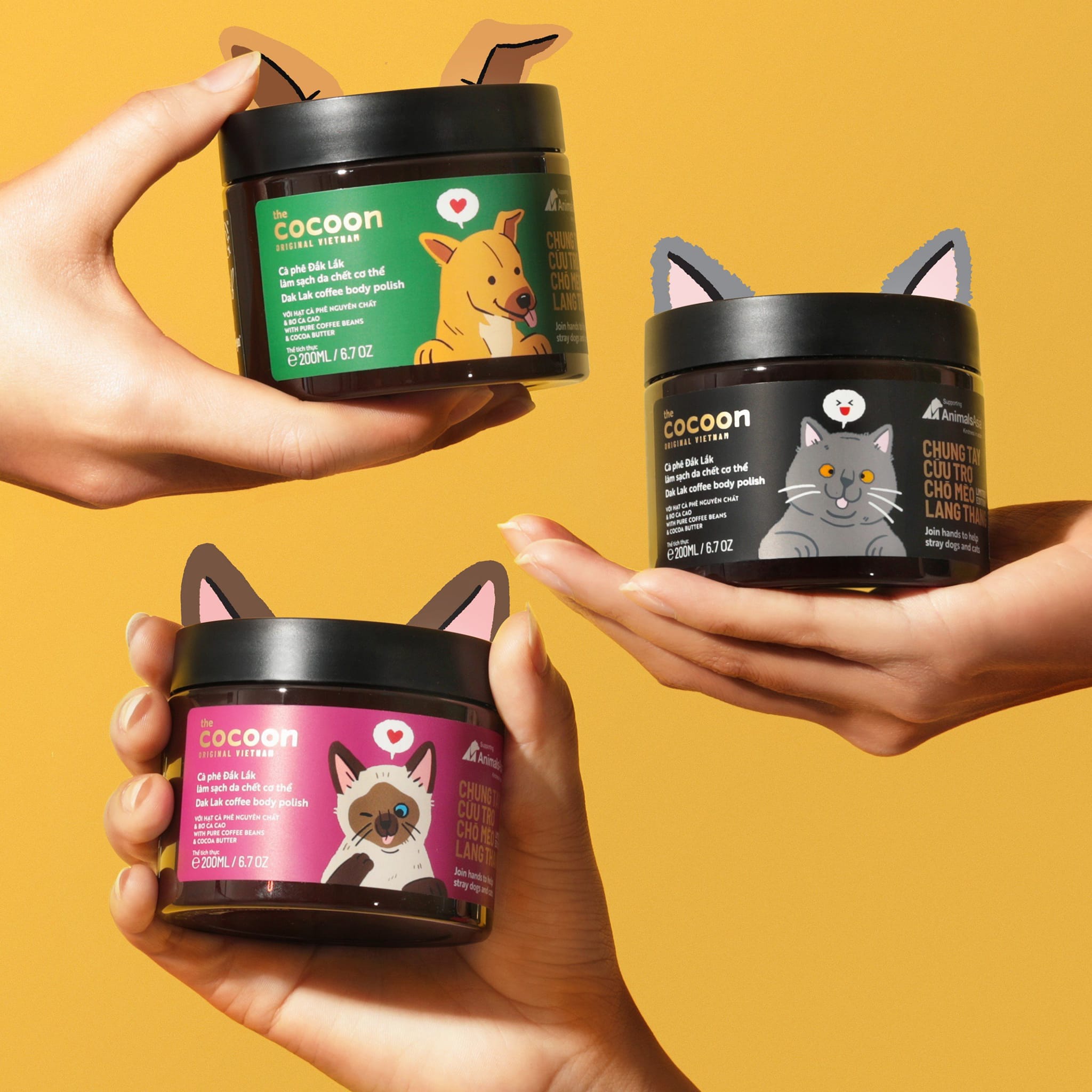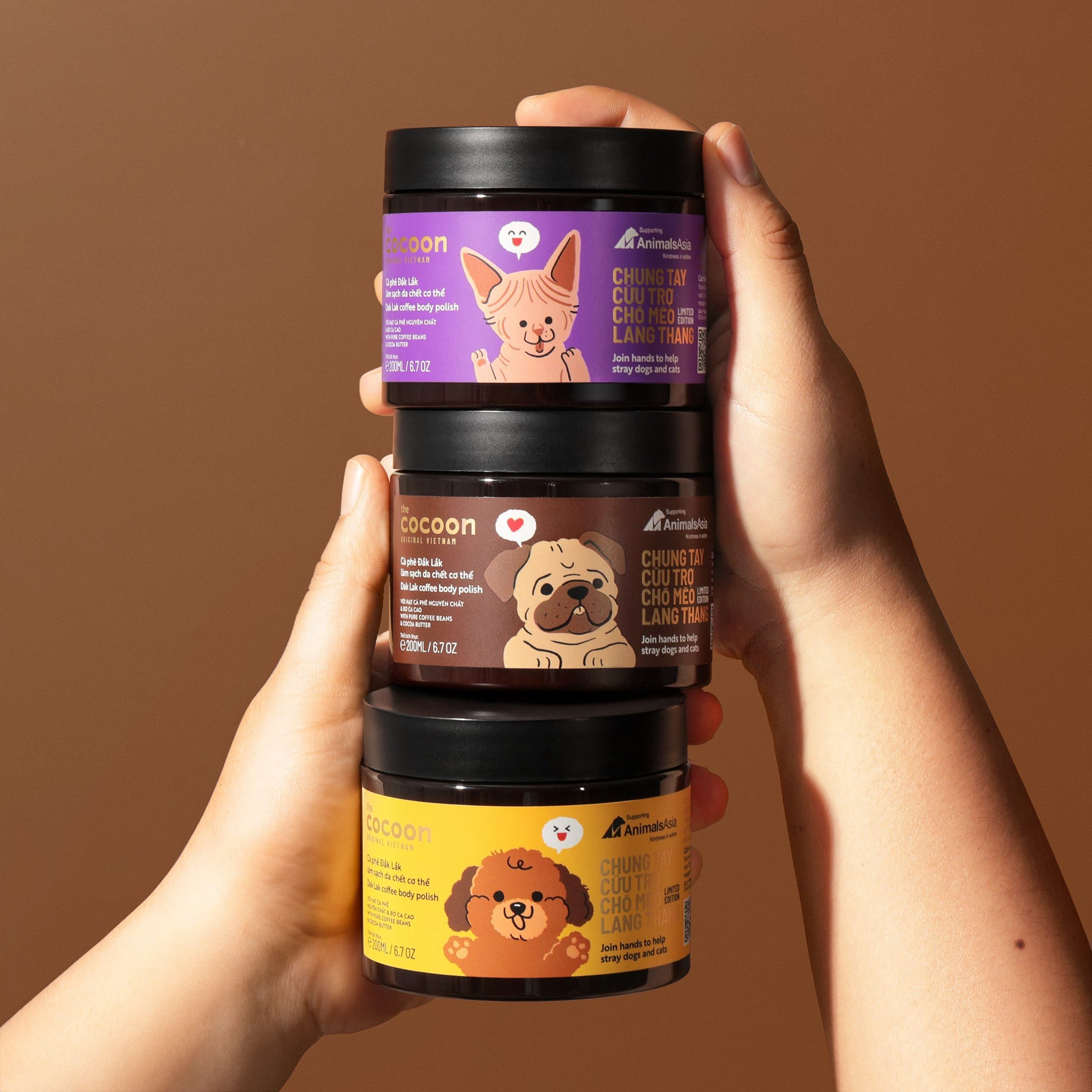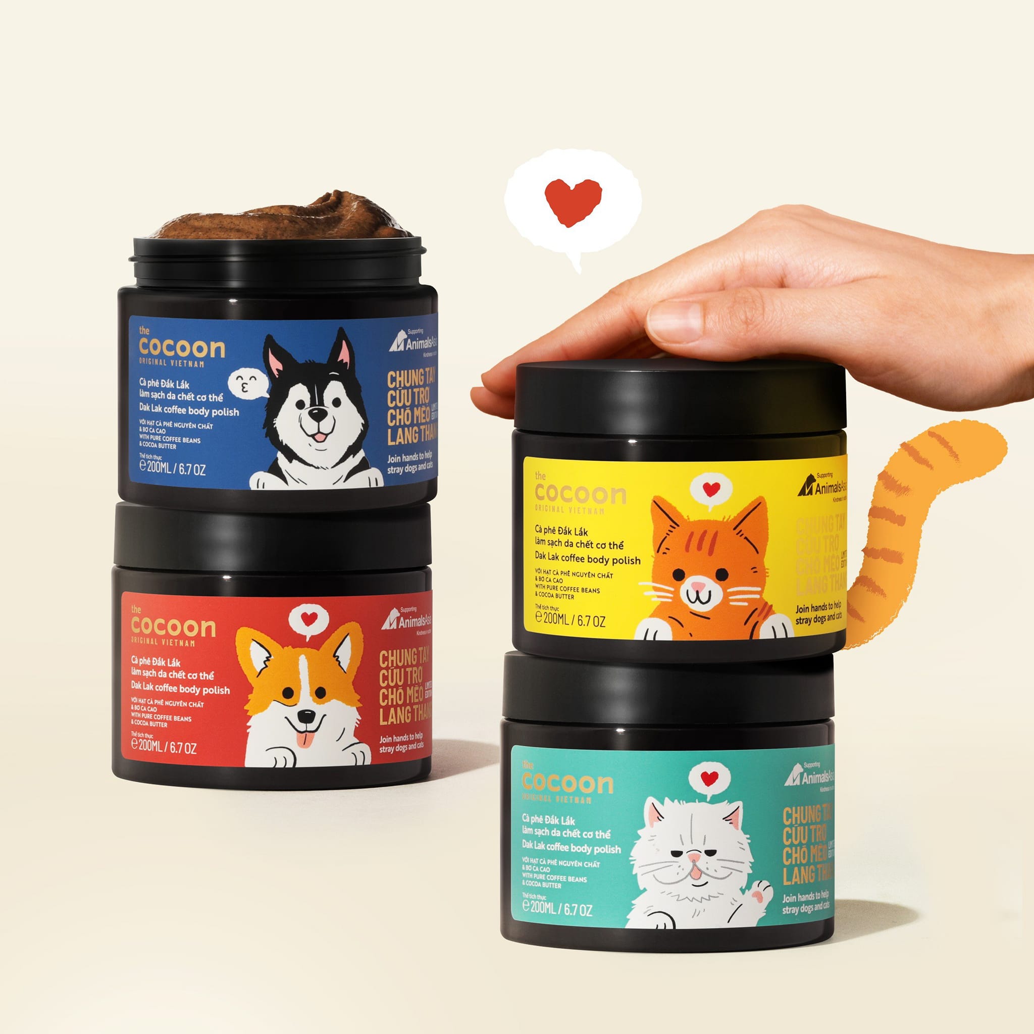 Tẩy Da Chết Cocoon Dak Lak Coffee Body Polish Từ Cà Phê Đak Lak 200ml là sản phẩm được tạo từ những hạt cà phê Đắk Lắk nguyên chất xay nhuyễn, hòa quyện cùng bơ cacao Tiền Giang giúp loại bỏ tế bào chết hiệu quả, làm đều màu da, mang lại năng lượng, giúp da trở nên mềm mại và rạng rỡ. Cocoon đồng hành cùng Tổ chức Động vật Châu Á AAF trong chiến dịch "Chung tay cứu trợ chó mèo lang thang" với bộ sưu tập các PHIÊN BẢN GIỚI HẠN của chiến dịch. Mỗi “chiếc áo mới” sẽ có một màu sắc chủ đạo riêng, với hình ảnh đáng yêu của những em chó mèo khác nhau và đặc biệt là thông điệp “CHUNG TAY CỨU TRỢ CHÓ MÈO LANG THANG” được ép kim nổi bật.