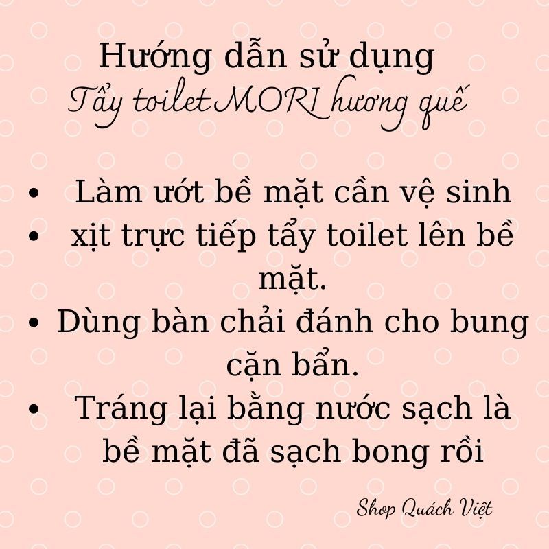 Từ ngày có tẩy toilet MORI, công cuộc dọn dẹp trở lên nhanh gọn hẳn. Dọn dẹp không những sạch sẽ tinh tươm, lại còn ko có mùi CLo, thay vào đó là tinh dầu quế dịu nhẹ. Yêu lắm những điều nho nhỏ.