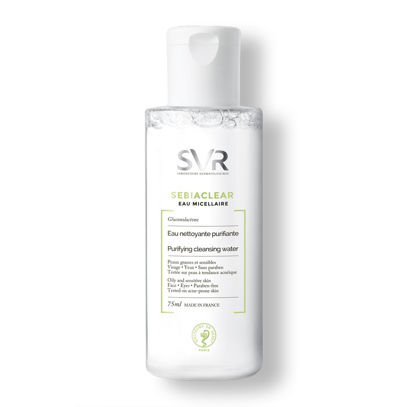 Nước Tẩy Trang Làm Sạch Da Và Loại Bỏ Dầu Trên Da SVR Sebiaclear Eau Micellaire 75ml 1. Công Dụng : – Giúp làm sạch da, làm sạch các lớp trang điểm và loại bỏ cặn bẩn, dầu thừa trên da mà không làm khô da. Đồng thời giúp làn da sạch và tươi mát như ý. – Sản phẩm là dòng sản phẩm cải tiến giúp xử lý các đốm mụn mủ , loại bỏ mụn nhọt, mụn đầu đen, làm thông thoáng lỗ chân lông nhằm mang lại hiệu quả tối ưu và vô cùng thoải mái khi sử dụng. – Hiệu quả được chứng minh sau 7 ngày sử dụng trên mụn trứng cá. Bởi vì tất cả mọi loại da khác nhau đều có thể dễ bị mụn, phòng thí nghiệm SVR đã cải tiến bằng sự phối hợp độc đáo các hoạt chất, có tác dụng trên tất cả mọi loại da.