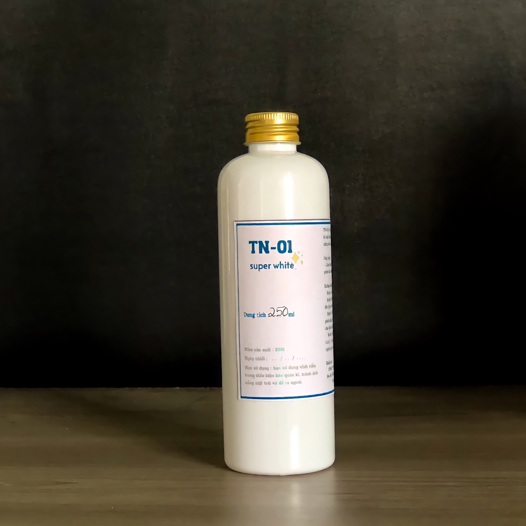 Hướng dẫn sử dụng : Bước 1 : Làm sạch bề mặt nhựa cần tẩy trắng và lau khô. Bước 2: Pha dung dịch TN-01 với nước một ít nước rửa chén tỉ lệ 9:1 và khuấy đều (pha với nước rửa chén để làm dung dịch kết dính tốt hơn trên bề mặt). Bước 3 : Bôi dung dịch lên bề mặt nhựa, lấy bao nilon trong suốt bọc kín lại và mang ra phơi nắng.(bọc kín bao nilon để tránh làm dung dịch bay hơi, phải luôn đảm bảo rằng trong quá trình phơi nắng bề mặt nhựa luôn được ướt bởi dung dịch, nếu dung dịch bị khô thì hãy tiến hành bôi lại). Bước 4: Mang nhựa vào rửa thật sạch, lau khô và tận hưởng thành quả. - Nếu độ trắng chưa được như ý thì hãy lặp lại bước 3 vào ngày kế tiếp cho đến khi đạt độ trắng như ý.