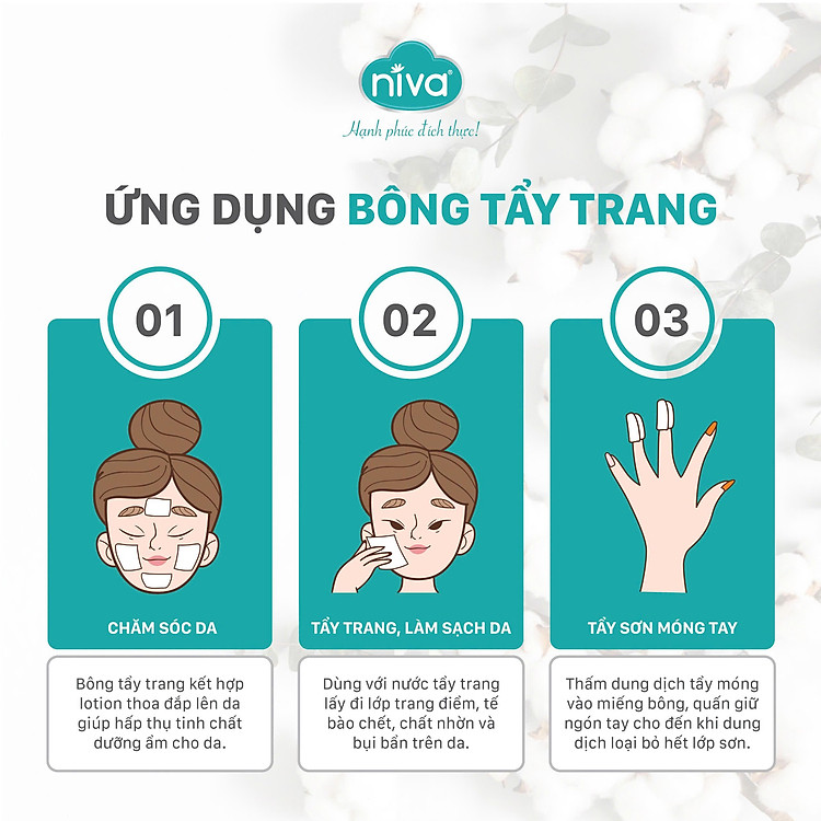Bông tẩy trang cao cấp Niva CV3 được làm từ 100% từ bông tự nhiên, mềm mại và an toàn với cả những làn da nhạy cảm. Kết cấu miếng bông chắc chắn, không xô, thấm hút tốt, tiết kiệm và làm sạch hiệu quả.