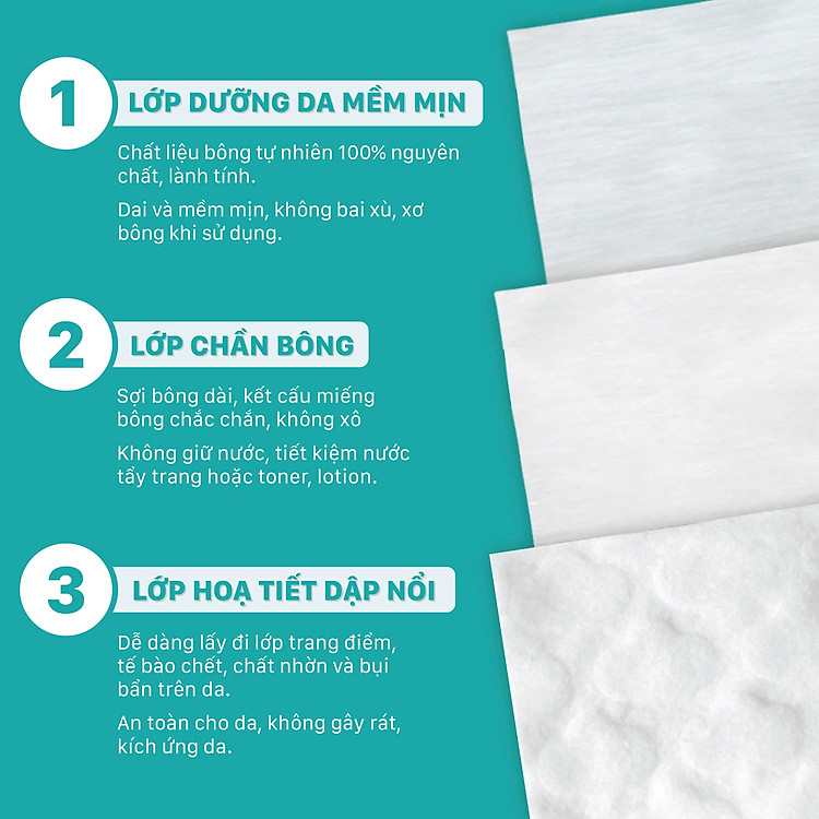 - Độ dày bông vừa phải, không giữ nước, tiết kiệm nước tẩy trang hoặc toner, lotion khi sử dụng.