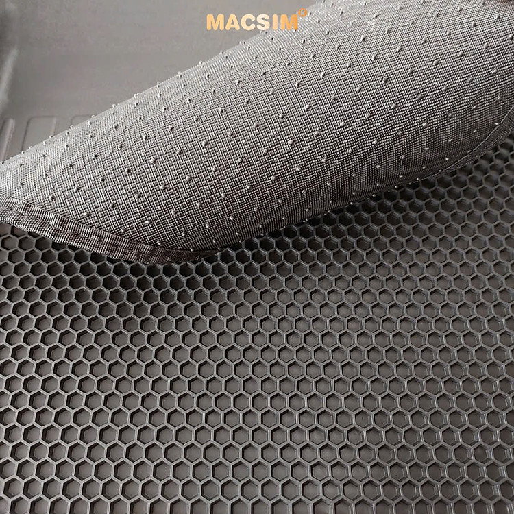 Lớp 2: Thảm dạng lưới lục giác giấu bụi bằng cao su PBR (Polybutadiene Rubber): Chất liệu cao su PBR dẻo dai, độ đàn hồi cao, chống mài mòn cực tốt, không mùi, thân thiện với môi trường và sức khỏe. Thiết kế dạng lưới lục giác 3D thông minh giúp giấu bụi, giữ lại rác và đất cát mà không bị lộ ra ngoài. Khả năng bám sàn tốt, giúp thảm không bị xô lệch khi sử dụng. Có thể tháo rời dễ dàng để vệ sinh riêng, giữ cho lớp dưới luôn sạch sẽ.
