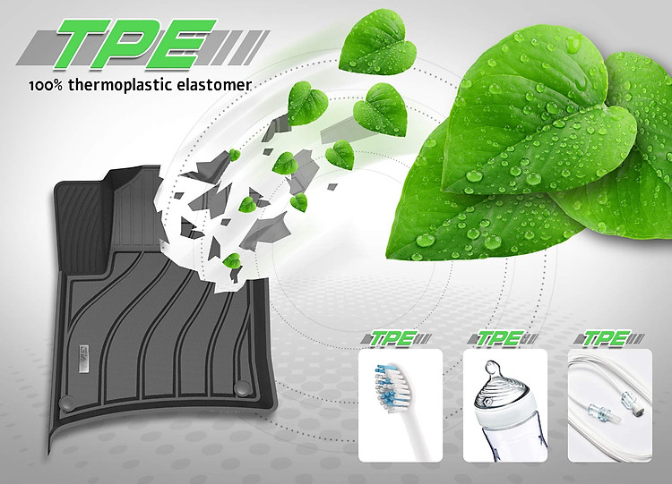 – Chất liệu: từ các hạt nhựa TPE gốc (Thermoplastic Elastomer) là chất liệu cao cấp không gây độc hại có tính đàn hồi cao, bền bỉ và không gây mùi kể cả trong thời tiết khắc nghiệt nhiệt độ cao. Sản phẩm thân thiện với môi trường, sản xuất từ hạt nhựa TPE gốc được sản xuất lần đầu có thể tái sử dụng nhiều lần.