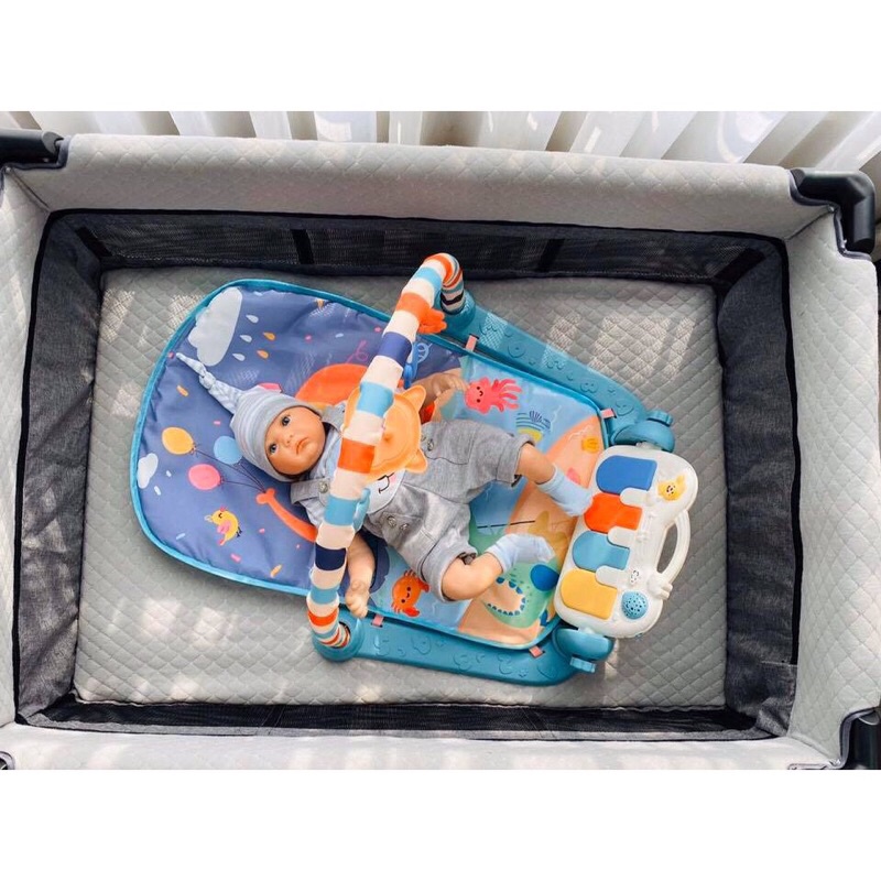 THẢM NHẠC CHO BÉ 🍂 Sản phẩm thảm nhạc cho bé với rất nhiều tiện ích và ưu điểm: - Kích thích phát triển thị giác và trí não nhờ các đồ vật treo ngộ nghĩnh cùng các sắc màu tươi vui - Tăng cường sự vận động cơ thể của trẻ, đặc biệt là tay và chân khi nằm chơi - Ba mẹ sẽ rảnh rang hơn vì bé tập trung chơi đùa với thảm nhạc mà không quấy khóc 🍂 Chất liệu: Nhựa ABS + Vải, không chứa hóa chất độc hại an toàn cho bé 🍂 Kích thước : 73 x 58 x 43 cm 🍂 Sử dụng pin 🍂 Có thể chơi bằng 3 cách: bé nằm, ngồi hoặc đứng. 🍂 Thiết kế có thanh đồ chơi phía trên và phía cuối bé nằm có bàn piano, khi bé đạp chân vào sẽ tạo ra những giai điệu khác nhau 🍂 Thảm nằm chơi với chất liệu vải mịn, mềm, không gây độc hại cho bé, giúp bé cảm thấy thoải mái khi ngồi hay nằm chơi. 🍂 Thiết kế in hình voi con và cá sấu cùng với các bạn cua cá mựa gam màu cam tím dễ thương