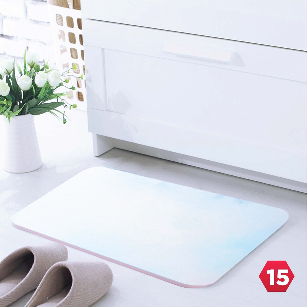 <2> ĐẶC ĐIỂM Thảm đá nhà tắm siêu thấm hút - thảm chùi chân hút nước - thảm lau chân kích đá kích thước 39x60x0.9cm Thảm cứng siêu thấm 60 x 40 x 0,9 cm được sản xuất theo công nghệ Nhật Bản với chất liệu đặc biệt là diatomite. Diatomite là hoá thạch của vỏ tảo, sinh vật phù du và rong rêu... lắng cặn dưới đáy sông, hồ, biển khoảng 10 triệu năm trước. Nhờ có vô vàn lỗ nhỏ li ti trên bề mặt diatomite với đường kính 0,1 - 0,2 micromet nên thảm có khả năng thấm hút siêu nhanh và lập tức giải phóng lượng ẩm vào không khí khiến cho bề mặt thảm luôn khô ráo. Chất liệu siêu thấm nước, giúp khô chân nhanh Chỉ cần đứng lên tấm thảm khi bước ra khỏi nhà tắm, ngay lập tức toàn bộ nước ở mặt bàn chân được thảm thấm hút hoàn toàn, thời gian thấm khô đôi bàn chân chỉ sau 2 đến 3 lần di chuyển chân và chỉ mất khoảng 5 giây. Khả năng thấm nước tối đa tới 65% trọng lượng thảm và vẫn tiếp tục thấm hút thêm lượng nước mới nhờ vào việc thoát khí ẩm một cách tự nhiên ra môi trường bên ngoài được diễn ra liên tục.