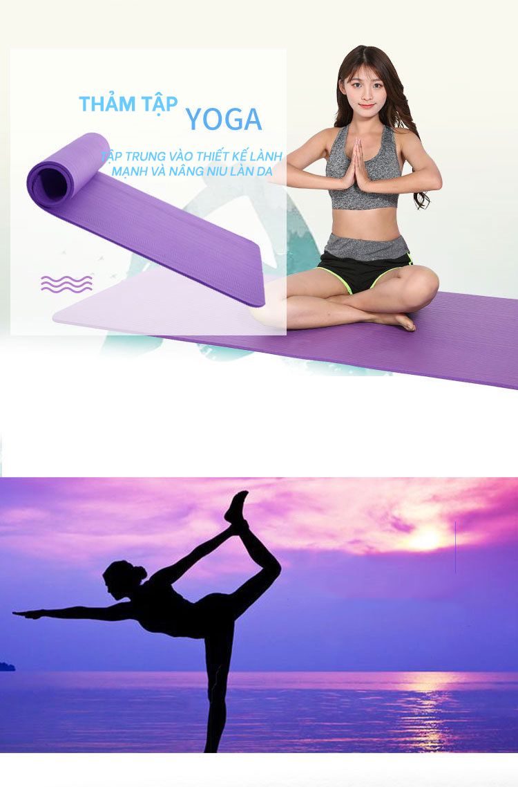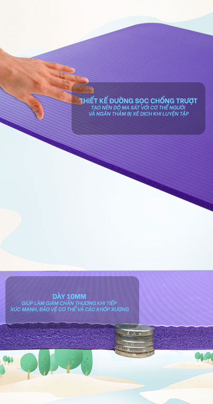 - Thảm dày 8mm, êm ái, đây là lớp đệm giữa cơ thể bạn và sàn cứng, bảo vệ cột sống, xông, đầu gối và khủy tay hiệu quả trong suốt quá trình tập Yoga.
