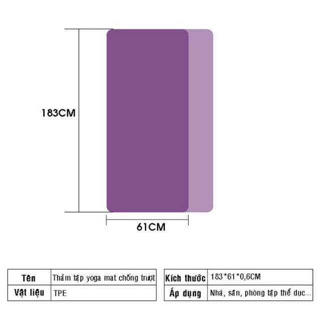 • Chất liệu: thảm tập Yoga được làm bằng chất liệu TPE, một loại mút xốp đàn hồi nhiệt dẻo thay thế cho dòng thảm tập Yoga làm bằng chất liệu PVC, giúp thảm tập Yoga có độ mềm mại và độ bám dính tốt, không độc hại, không kích ứng da, thân thiện với môi trường so với các loại thảm tập Yoga khác