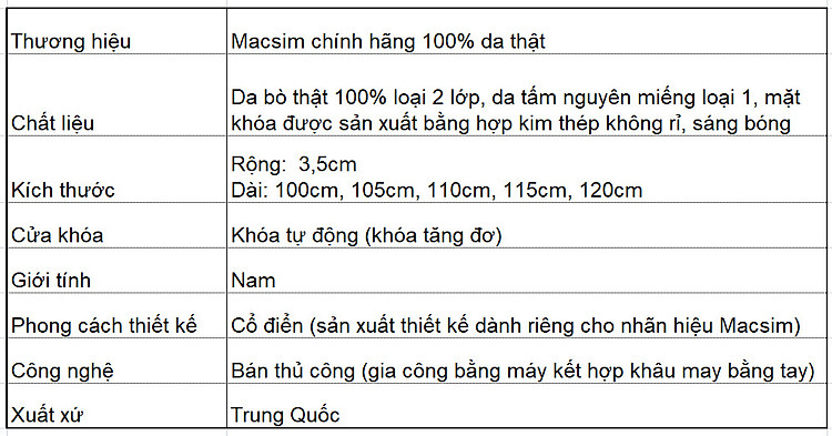 Thắt lưng Macsim là phụ kiện thời trang cao cấp, thiết kế dáng cổ điển mang phong cách riêng, đơn giản lịch lãm, sang trọng, bền theo thời gian. Thắt lưng Macsim phù hợp cho nhiều phong cách thời trang dễ dàng phối nhiều trang phục như: Quần âu, quần áo vest, quần kaki, quần bò...Với thiết kế thắt lưng cổ điển đơn giản nhưng rất trang nhã thanh thanh lịch được giới văn phòng công sở, doanh nhân ưa thích và tin dùng. Thắt lưng nam da thật cao cấp Macsim là quà tặng đáng nhớ, đầy ý nghĩa cho người thân, đồng nghiệp, bạn bè.