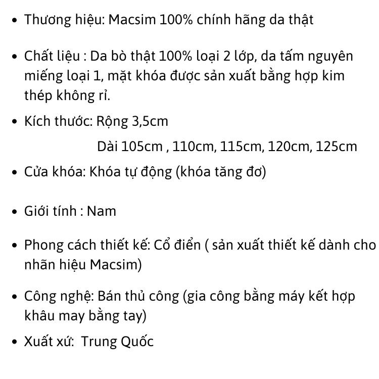 - Thắt lưng nam da thật cao cấp nhãn hiệu Macsim MS10 được bảo hành 1 năm với trường hợp khóa kim thắt lưng bị bong tróc, bề mặt da bị nổ tự nhiên, hoặc thắt lưng bị lỗi do nhà sản xuất.