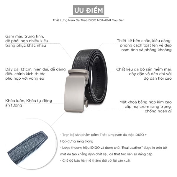 – Trọn bộ sản phẩm gồm: Thắt lưng nam da thật IDIGO-MD1-4041 + Hộp đựng sang trọng