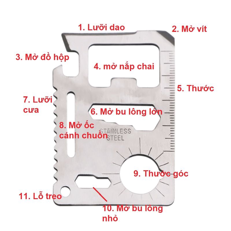 Thẻ công cụ gồm 11 chức năng: Dao, mở hộp, mở vít, mỏ bu lông bé, mở bu lông lớn, lưỡi cưa, mở nắp chai, thước, thước góc, mở ốc cánh chuồn và lỗ treo