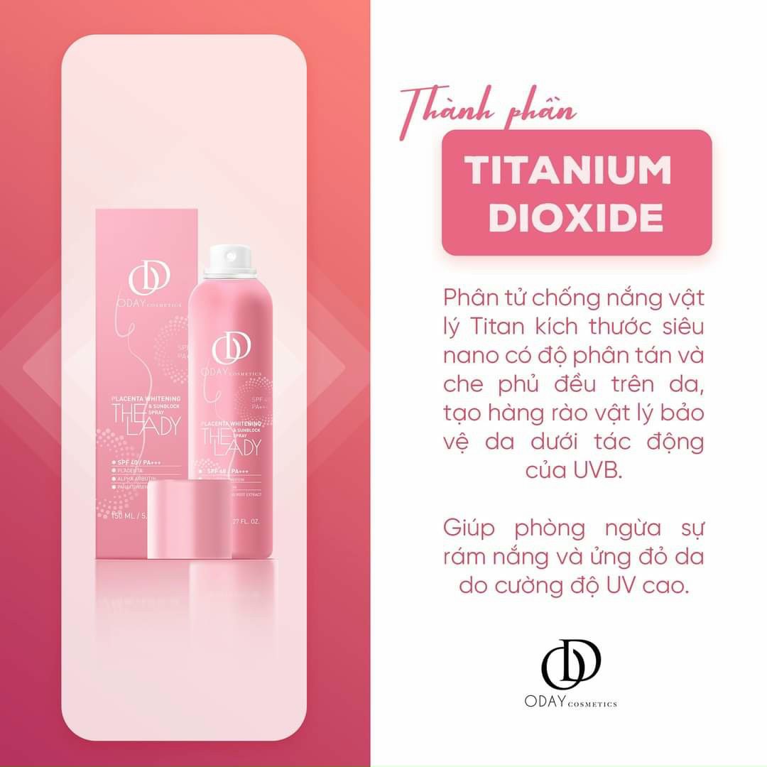 Với 2 thành phần chính nổi trội là ZINC OXIDE và TITANIUM DIOXIDE, Xịt chống nắng và dưỡng sáng da toàn thân THE LADY có độ phân tán và che phủ đều trên da, tạo hàng rào vật lý bảo vệ da toàn diện dưới tác động của UVA và UVB, giúp phòng ngừa lão hóa, cháy nắng và đen sạm.
