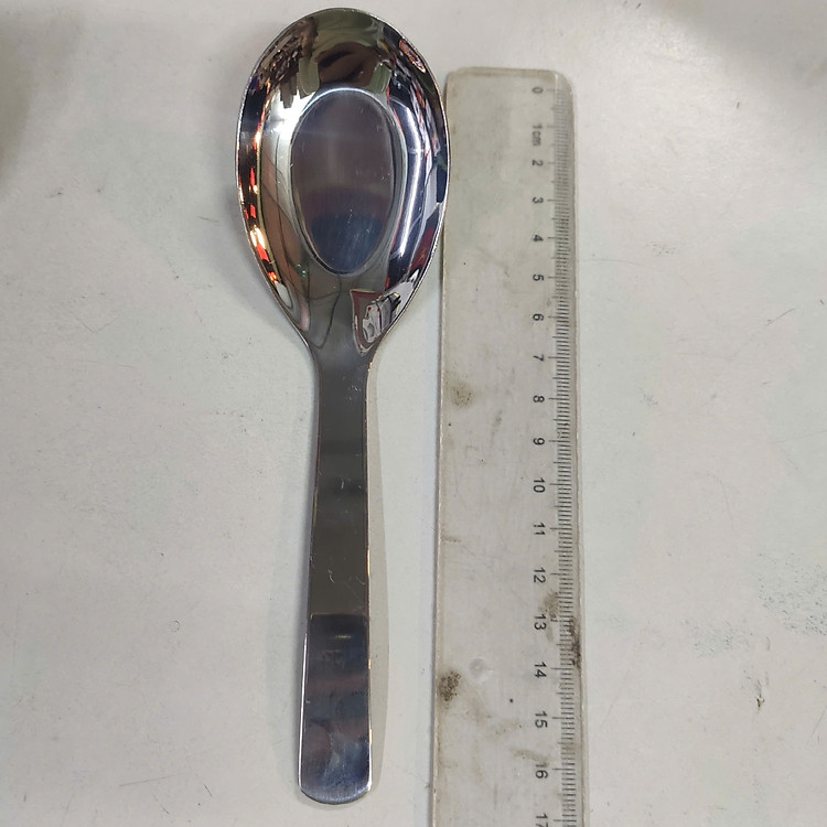 Kích thước: Dài 16.5cm, ngang miệng 4.6cm, Cao 1.5cm. Độ dầy 2mm (kích thước mặt phẳng đáy thìa 3.8 x 2.8cm)