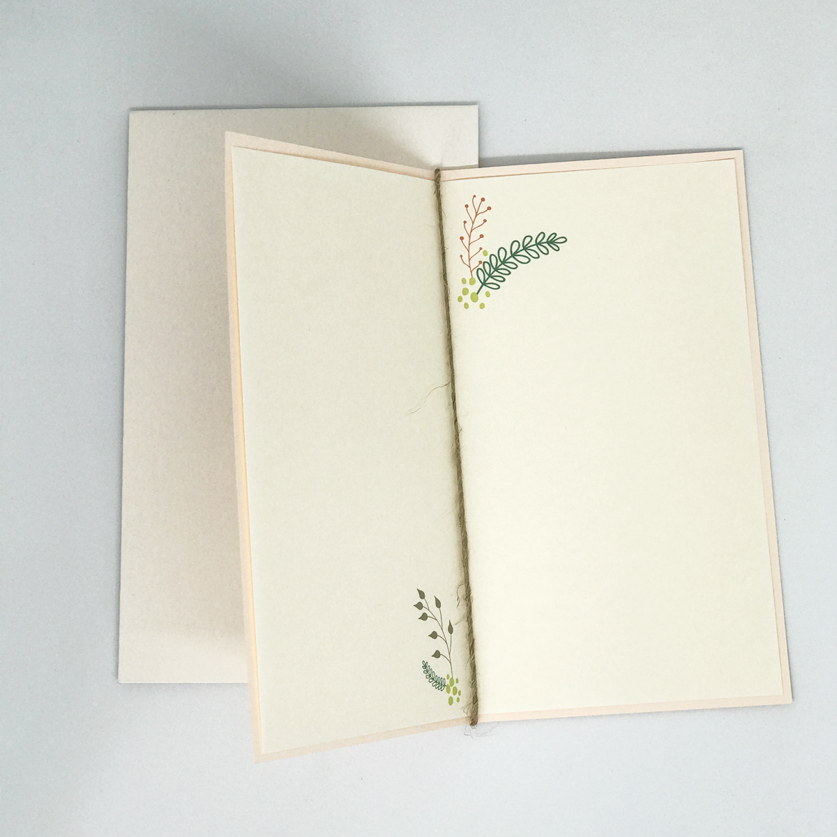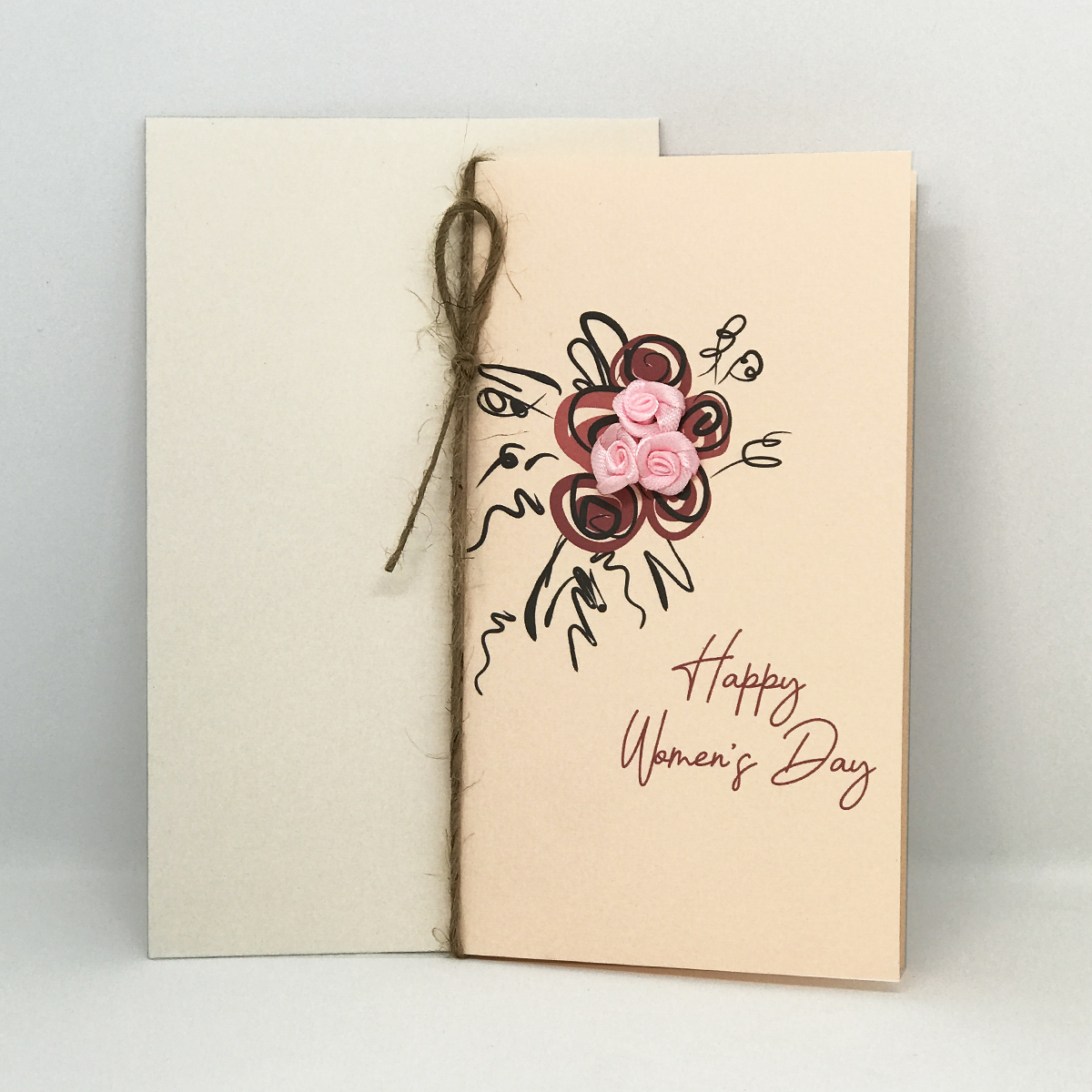 Thiệp được chăm chút tỉ mỉ từ khâu thiết kế đến chọn chất liệu giấy và tạo hình. Một chút nhấn nhá với dây cói, hoa vải dán nổi làm cho tấm thiệp thêm sinh động. Cũng là để cho người nhận có thêm niềm vui nho nhỏ.
