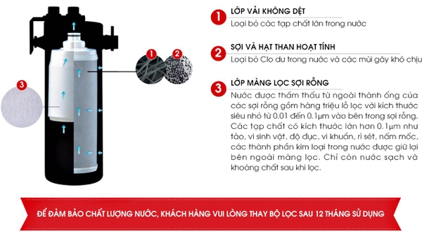 Công nghệ lọc nước tiên tiến ứng dụng mạnh mẽ khả năng lọc của lớp màng lọc sợi rỗng, mang lại nguồn nước an toàn hơn.