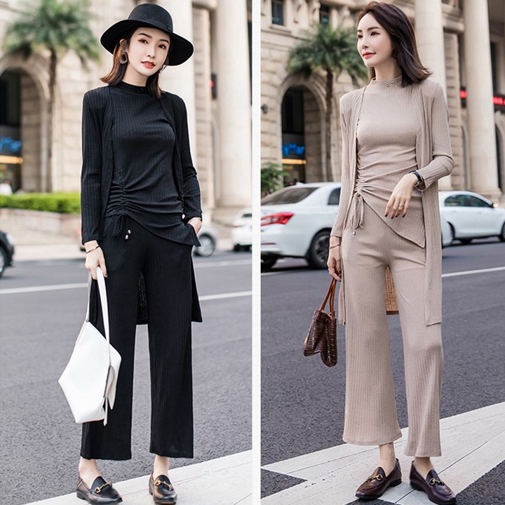 Một Set Bộ Thu Đông gồm: 1 Quần dài ống rộng thời trang, 1 áo cộc tay nhún eo cách điệu, 1 áo khoác cardigan đẹp 1. Quần dài: để phù hợp với xu thế thời trang hiện nay, thì mẫu quần ống rộng được shop cập nhật để đáp ứng nhu cầu của các chị em phái đẹp. Quần ống rộng là kiểu quần rất dễ mặc, nó mang lại nhiều lợi thế bởi có thể che được rất nhiều khuyết điểm. Nó phù hợp với mọi lứa tuổi, mọi dáng người, mọi phong cách. Và đặc biệt dù ở nhà hay đi làm, dạo phố thì quần ống rộng luôn đem lại vẻ kín đáo, thanh lịch nhưng không kém phần thoải mái.