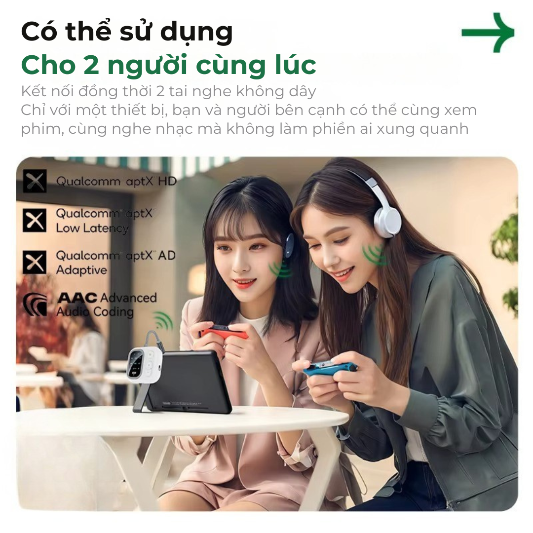 Hỗ trợ 2 tai nghe Bluetooth / 2 AirPods hoặc 2 điện thoại, nghe chung tiện lợi khi xem phim, nghe nhạc.