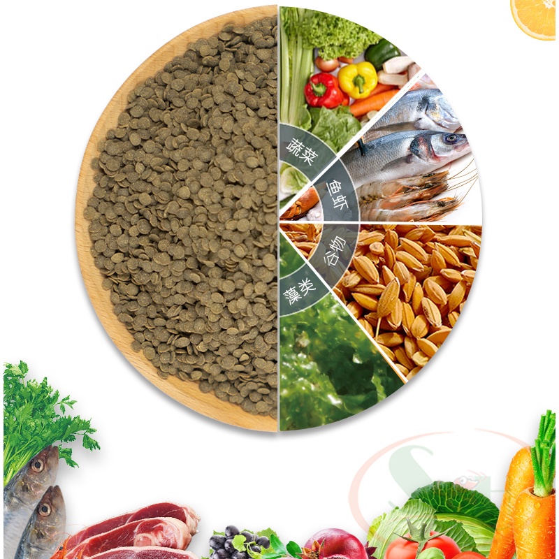 Thành phần: bột cá, bột tôm, bột mì, bột ngọc trai, bột côn trùng, trái cây, thực vật, bột đậu nành, men, tảo, rau củ, bột tảo, men tiêu hóa...