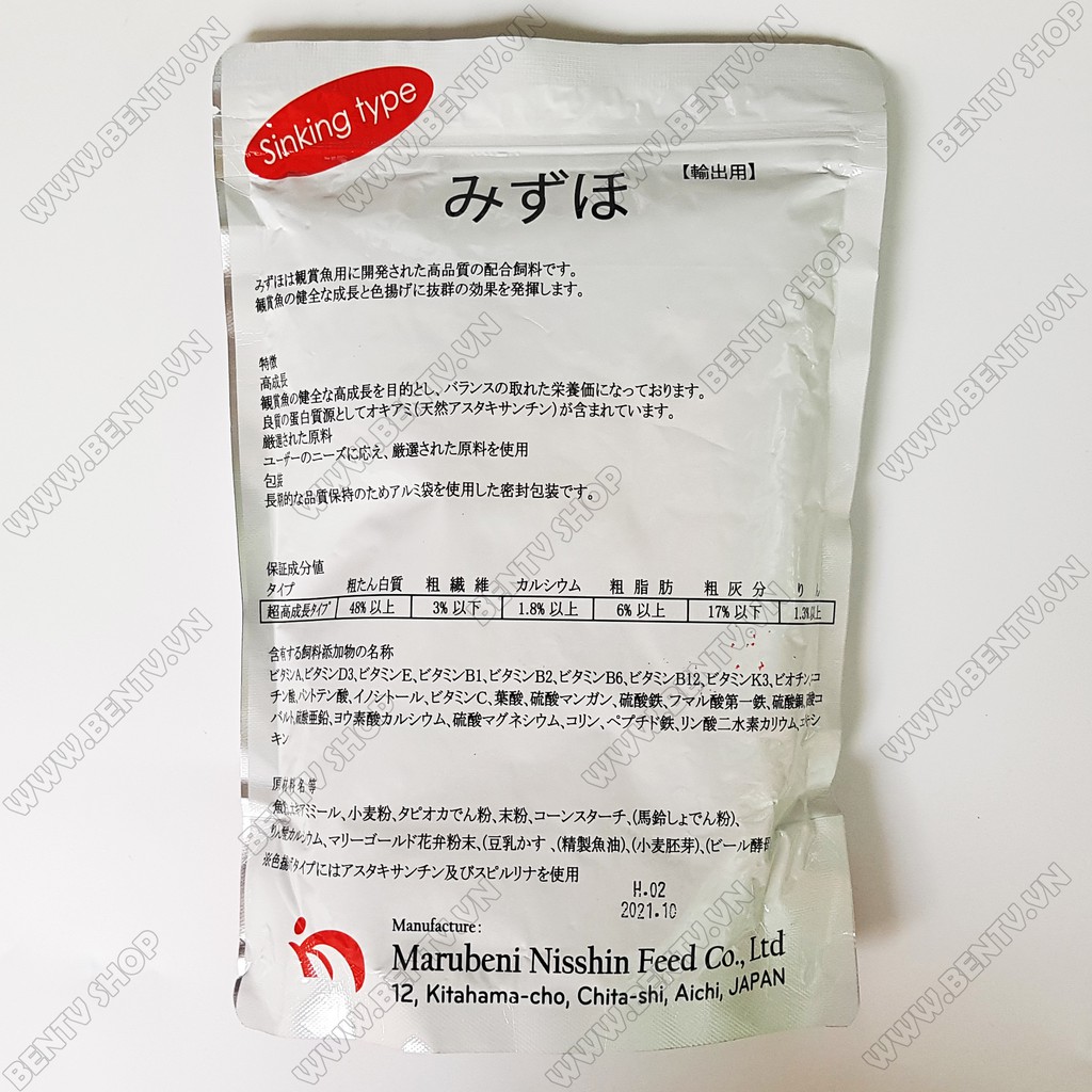 🐟 Thức Ăn Cá Vàng Cá Koi Mizuho Econmy Food 🐟 👉 Thức ăn cá vàng, cá koi Mizuho Econmy Food là thức ăn hỗn hợp chất lượng cao, do tập đoàn Marubeni Nisshin Nhật Bản sản xuất chuyên cho cá vàng. Thức ăn Mizuho Goldfish Food có hàm lượng chất dinh dưỡng cao, giúp cá vàng tăng trưởng, lên màu và phát triển khỏe mạnh. 👉 Thức ăn có dạng hạt chìm, không gây đục nước. 👉 Thành phần dinh dưỡng: Đạm thô (≥48%), Chất sơ (≤3%), Canxi (≥1.8%), Chất béo (≥6%), Crude Ash (≤17%), ... 👉 Thành phần nguyên liệu: Bột cá, bột nhuyễn, tinh bột sắn, bột năng, ... và các thành phần nguyên liệu khác. 👉 Kích thước hạt: khoảng 1.7mm 👉 Trọng lượng: 500g.